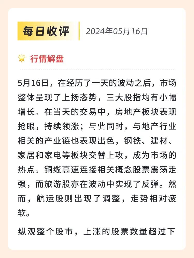 👉 5月16日,在经历了一天的波动之后,市场整体呈现了上扬态势,三大股指均有小幅增长。在当天的交易中,房地产板块表现抢眼,持续领涨;与此同时,与地产行业相关的产业链也表现出色,钢铁、建材、家居和家电等板块交替上攻,成为市场的热点。铜缆高速连接相关概念股票震荡走强,而旅游股亦在波动中实现了反弹。然而,航运股则出现了调整,走势相对疲软。