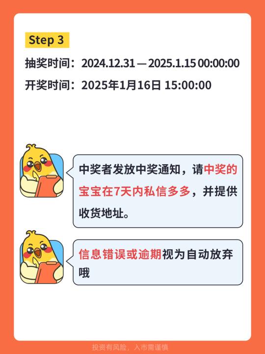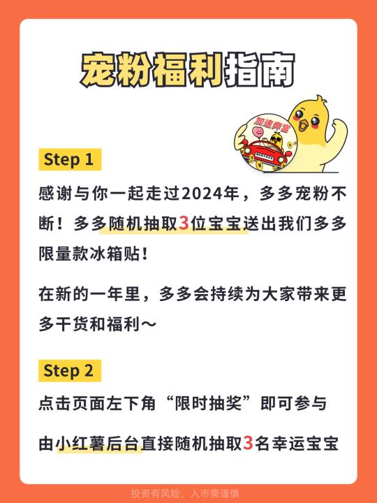 感谢与你一起走过2024年,多多宠粉不断!随机抽取3位宝宝送出我们多多限量款冰箱贴! 在新的一年里,多多会持续为大家带来更多干货和福利。 ❤️点击页面左下角“限时抽奖”即可参与 由小红薯官方后台直接随机抽取3名幸运宝宝 📅抽奖时间:2024.12.31 00:00:00-2025.1.15 00:00:00 😊中奖名额:3位 开奖时间:2025年1月16日 15:00:00 中奖者发放中奖通知,请中奖的宝宝在7天内私信多多,并提供收货地址。信息错误或逾期视为自动放弃哦👀