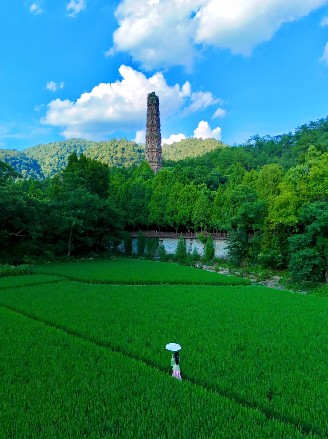 夏季绿意盎然的稻田和远望的千年隋塔