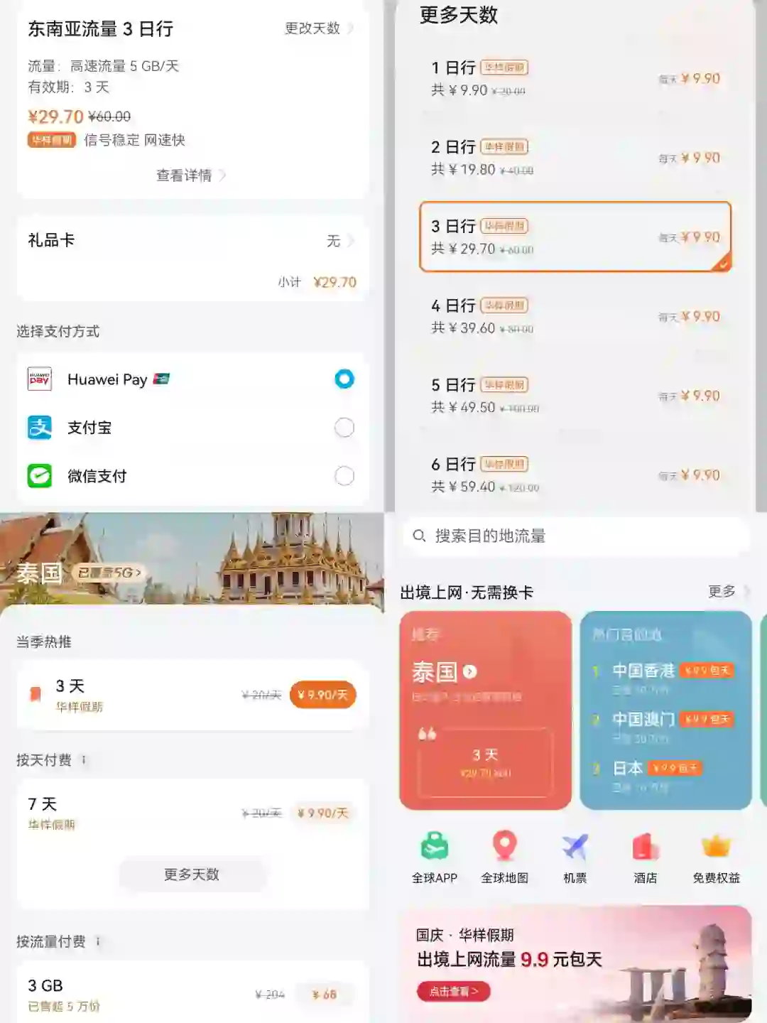 ✔️华为天际通:出国旅游要换手机卡,办理有点麻烦,我是用的华为天际通,不用换卡,直接用 的 9.9r 的 jing 外 tao 餐,在曼谷玩按天数算挺方便的,除了国内还能访国外app,用它下软件看电视啥的网速也蛮快的