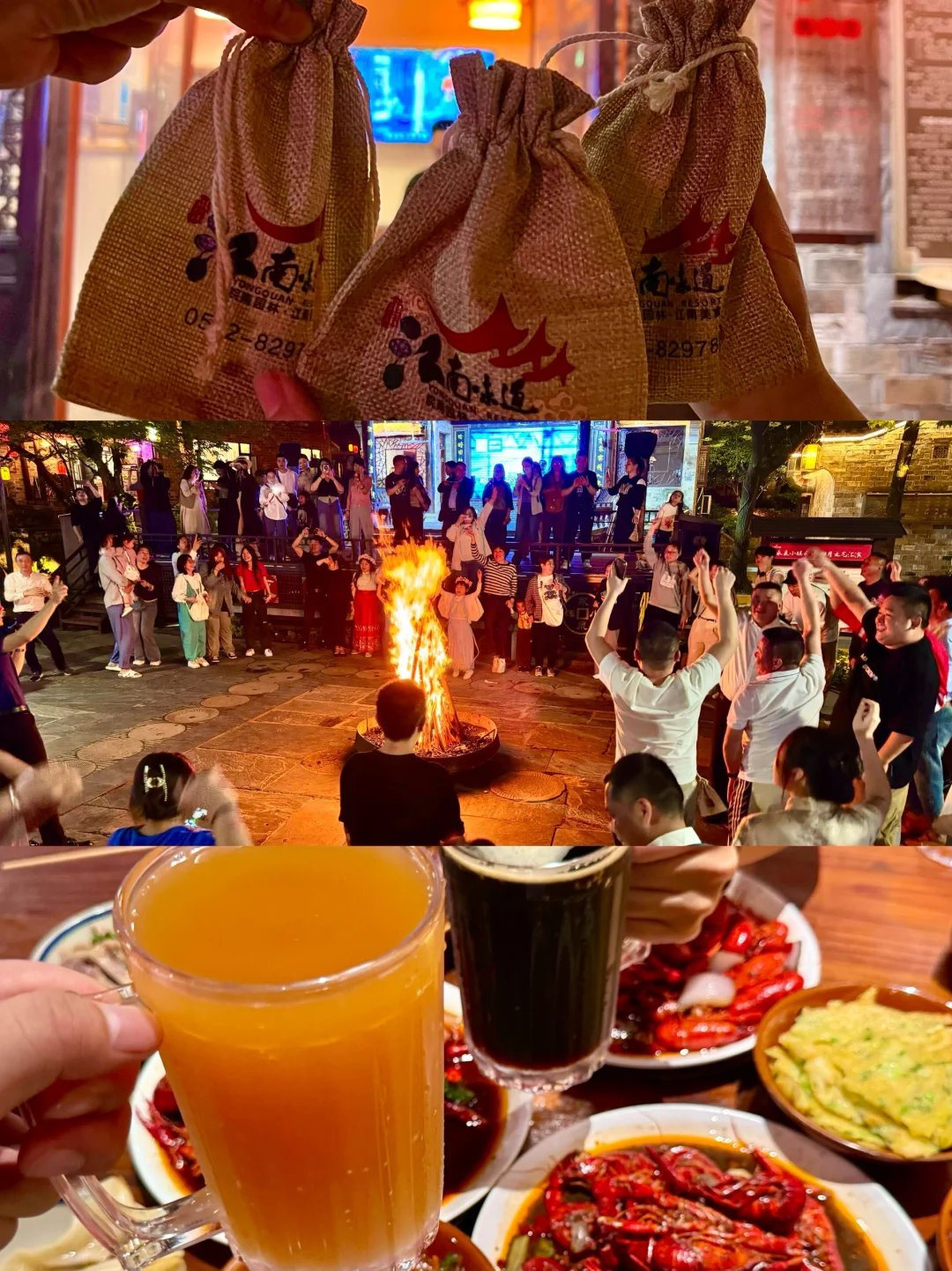 晚上在小镇用铜钱 买 皖南特色菜😋食材都很新鲜,米粉粑粑、杀猪汤、自酿🍺和小龙虾🦞…吃 了好多家 不 同摊 位,每样都来一点,饭后一起参加🔥篝火晚会,好热闹哇