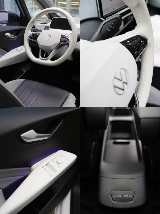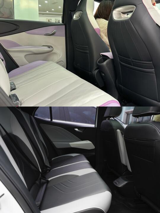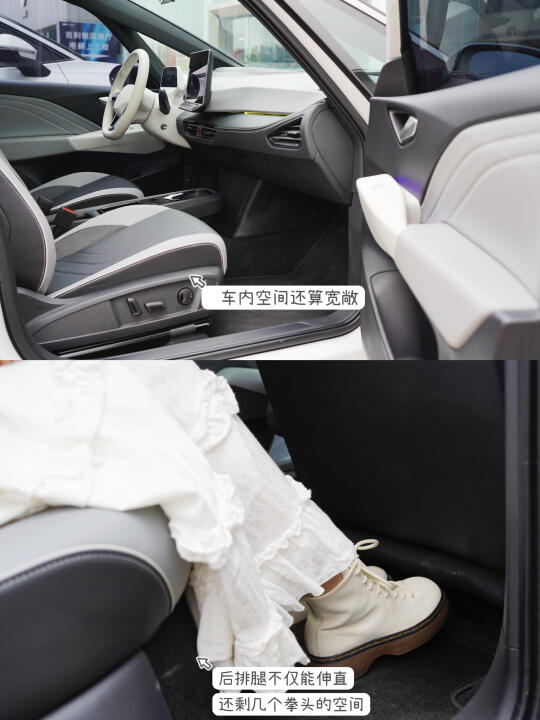 空间:腿部空间大概一拳到四指距离,后排横向空间和ID.3 差不多,有个手枕,坐4个人能更舒服。车内储蓄空间比较多,适合女生放各种可爱小东西。