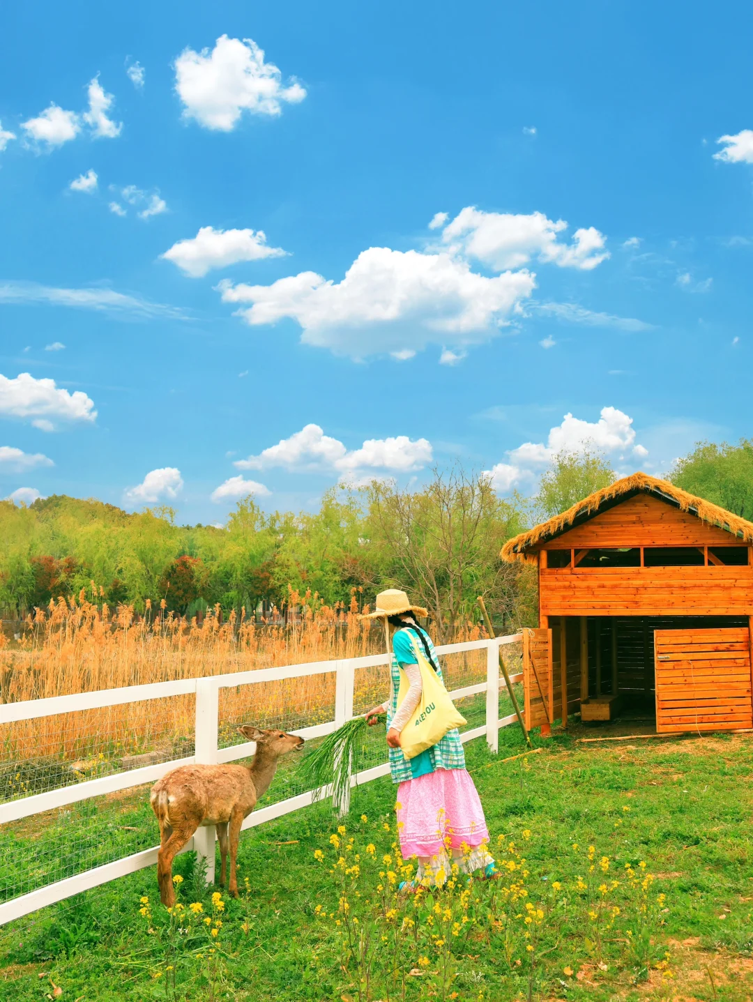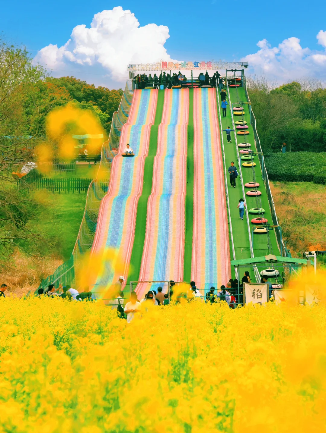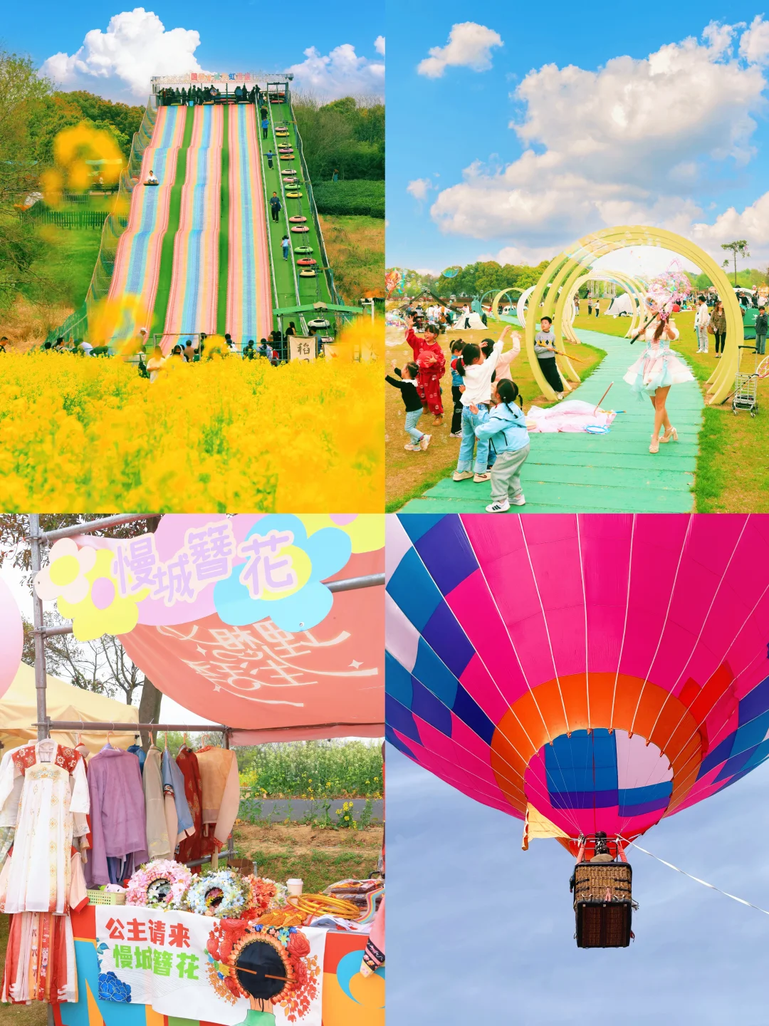 可以花田变装戴簪花穿汉服、去火山牧场喂小鹿、新 增的 动 力 伞、热气球太酷了、坐彩虹滑梯“咻”地冲进花田,玻璃漂流穿越松树林…