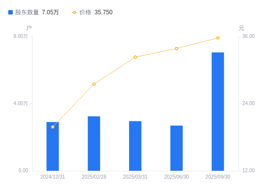 日期A股户数(户)流通A股户均持股数(股)户均持股市值(万元)2025-09-30705076492.0123.212025-06-302690516895.4557.212025-03-312953715327.7649.542025-02-283239613705.5637.662024-12-312906015278.9230.312024-09-303341313265.4819.262024-06-303076114408.7321.922024-03-312755616084.5936.452023-12-312846815569.3138.432023-09-303167513992.9631.77