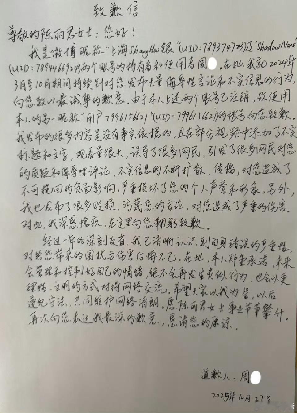 陈丽君告黑,网友视频道歉并手写致歉信,支持维权!
