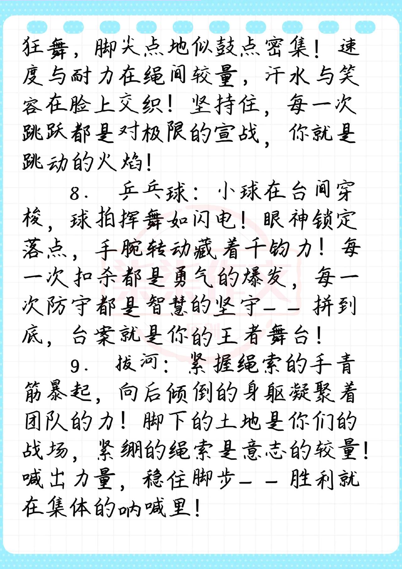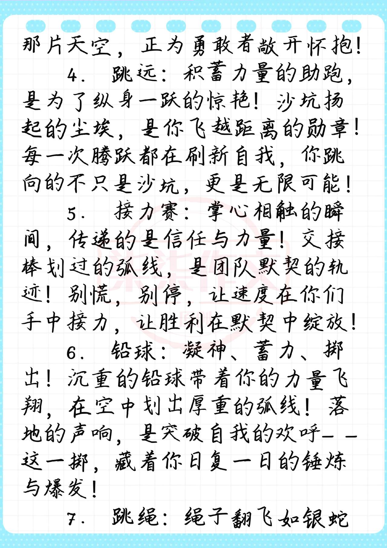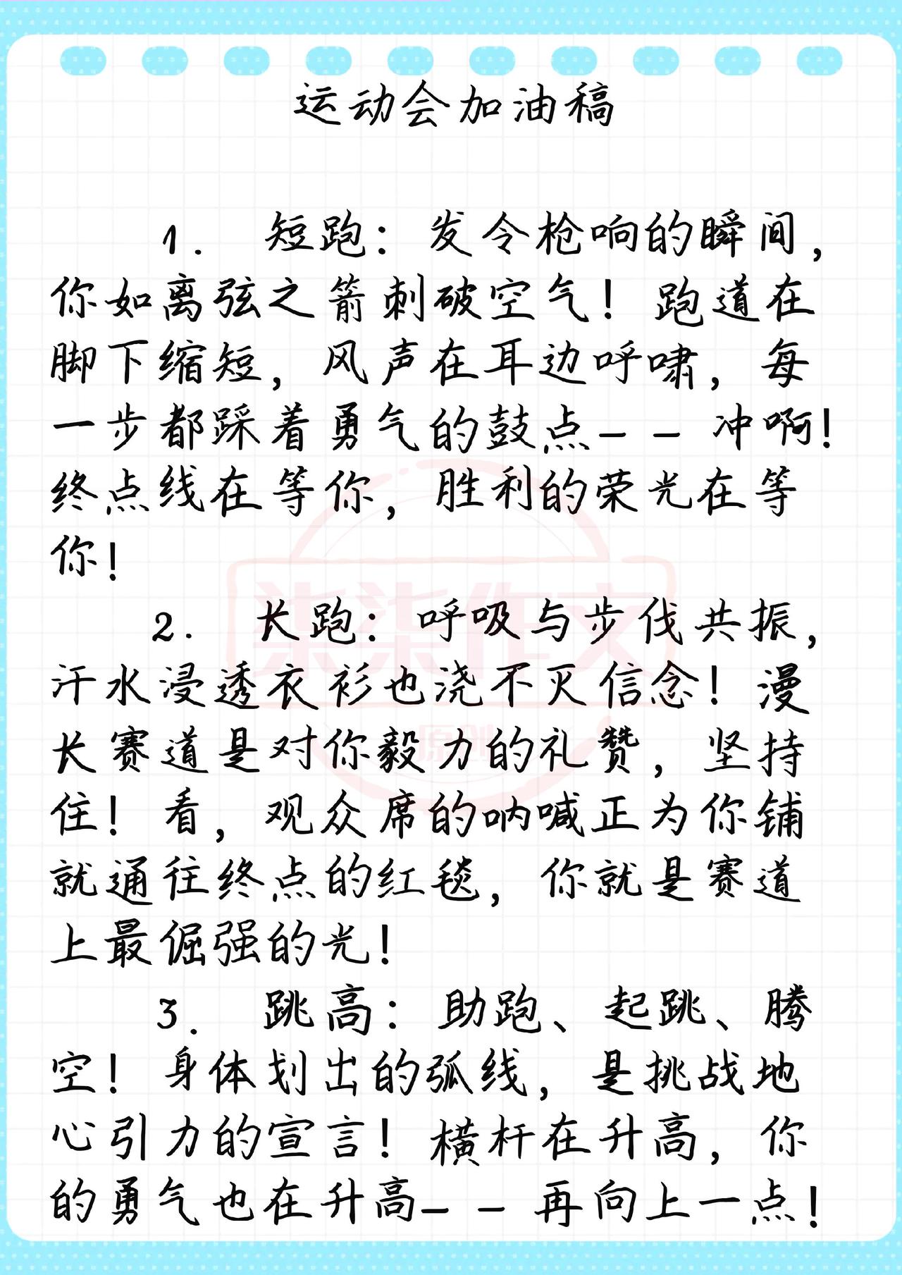 运动会加油稿:赛场上的每滴汗都闪着光!短跑如箭、长跑似歌,跳高腾跃、跳远惊鸿,接力传信任,铅球掷豪情。拼过,就是英雄;搏过,便无遗憾——为每个全力奔跑的你喝彩!加油稿 运动会加油助威词 运动会