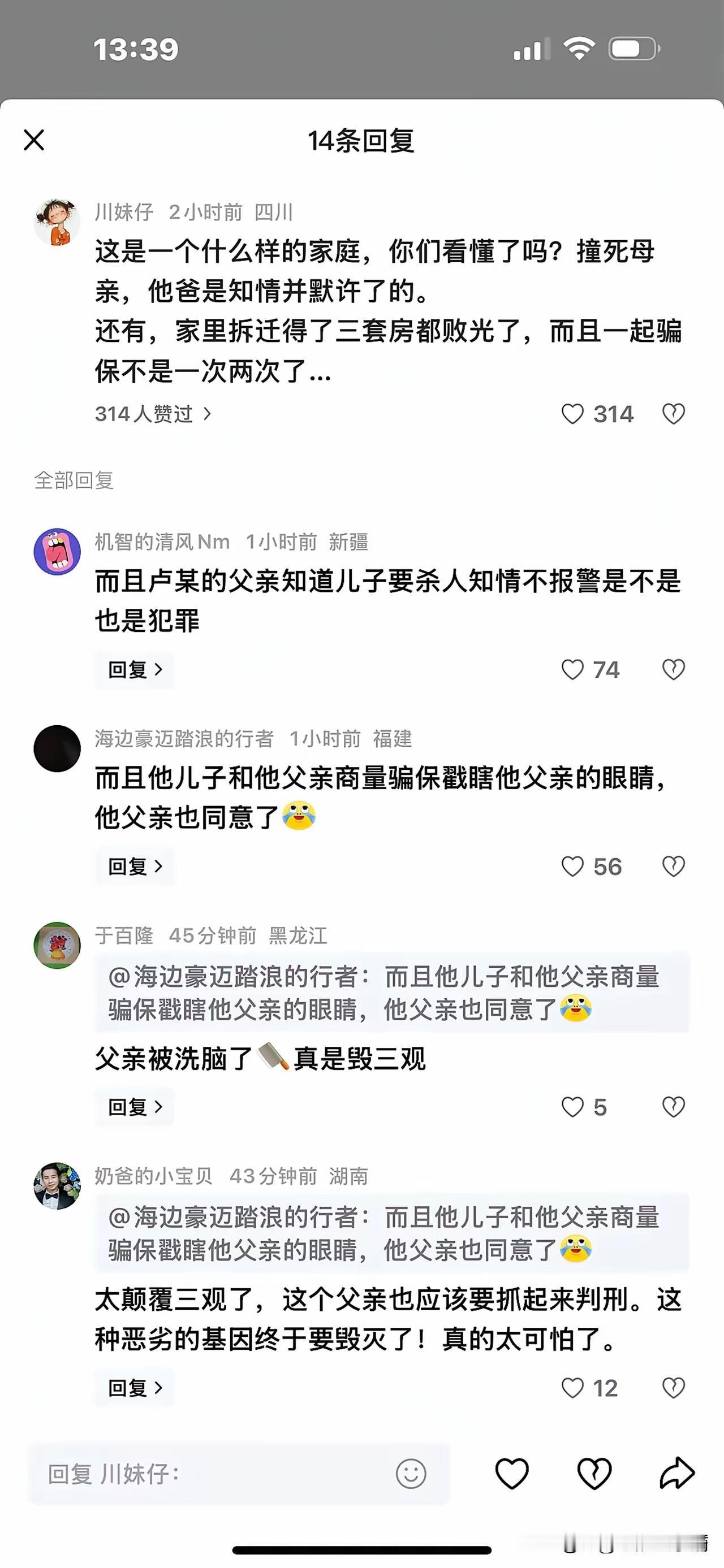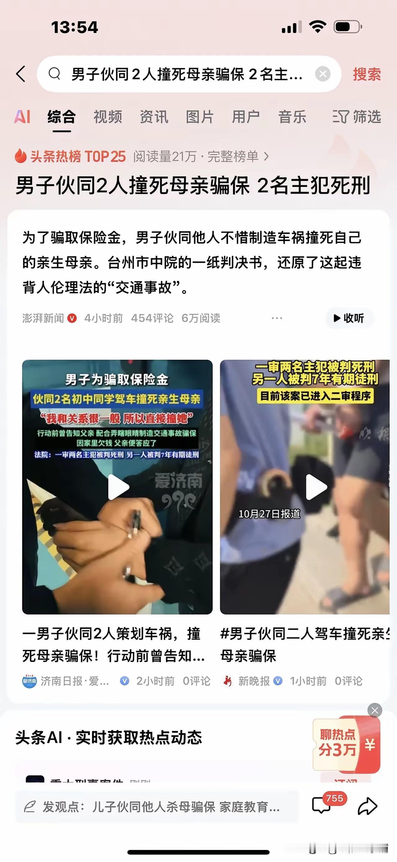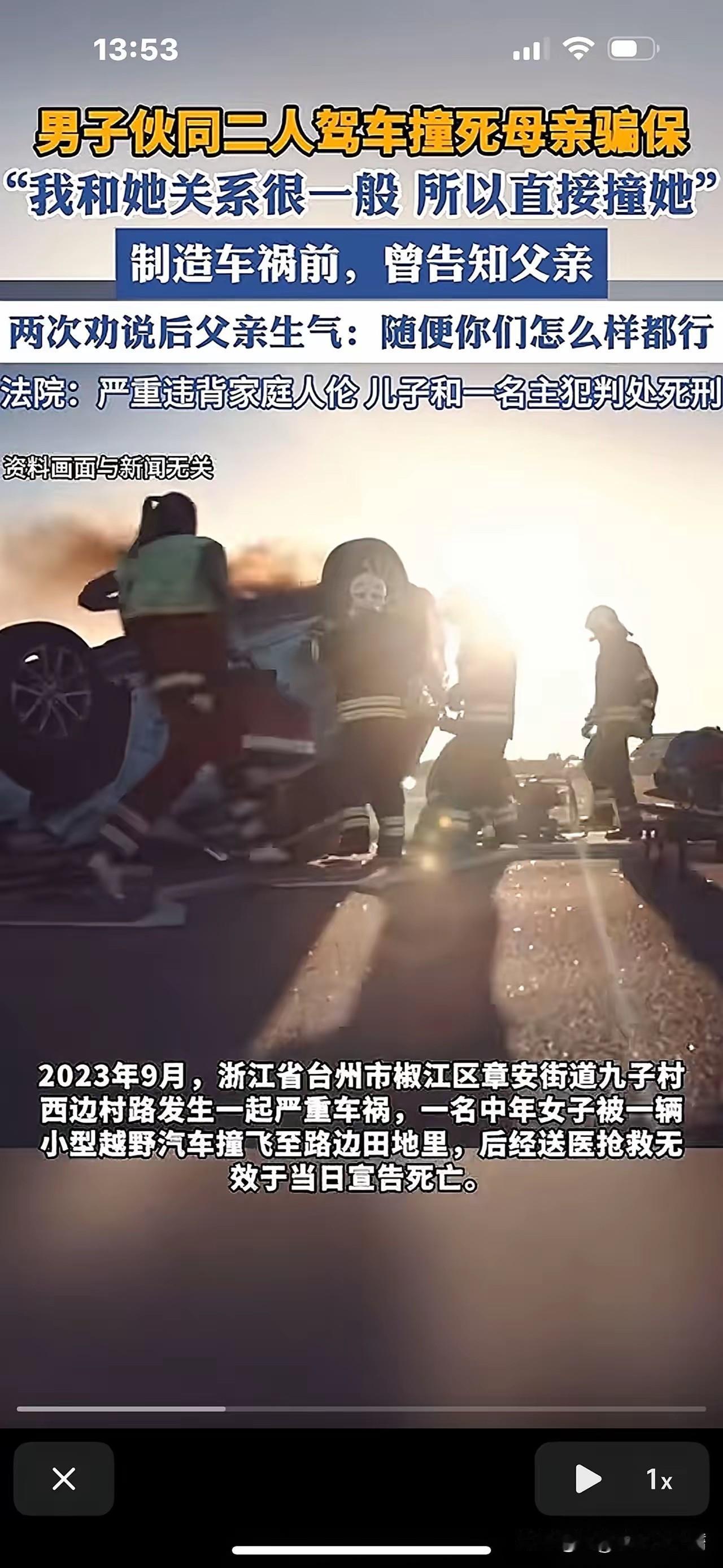 世界上总会有一些丧心病狂的人,这个儿子为了发财完全是没有人性,早已经违背了人伦纲常竟然和他的父亲协商,一同把他的亲生母亲给撞死了,就是为了骗取高额的保险费用,在他母亲生前,他给他母亲入了上百万的意外保险,然后他伙同其他两名小伙伴,然后在他母亲下班的路上故意把他母亲撞死,制造交通意外现场,在儿子实施罪恶计划之前,他儿子曾经和他父亲商量过,没想到他父亲竟然默许同意了,这是什么样的家庭啊?后来台州中级人民法院直接判处主犯死刑,立即执行,就是太令人发指了,竟然把自己亲生母亲给撞死,哪怕是没有养他,那也给了他生命啊!像这样的人渣不配活在世上!