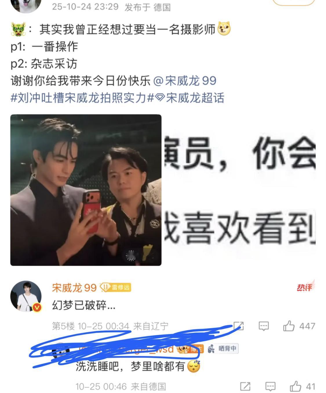 宋威龙的拍照技术全网皆知了,网友配文更是一绝…… 张婧仪说的真是一点没错,现场张婧仪和宋雨琦的美貌,龙龙是一点没捕捉到,刘冲晒出朋友拍的三人合照,高下立见。就是网友路拍的也比宋威龙拍的好……^_^好尴尬啊 是谁给宋威龙的自信呢,曾经还想当摄影师……哈哈 宋威龙 张婧仪看到宋威龙成片后的反应