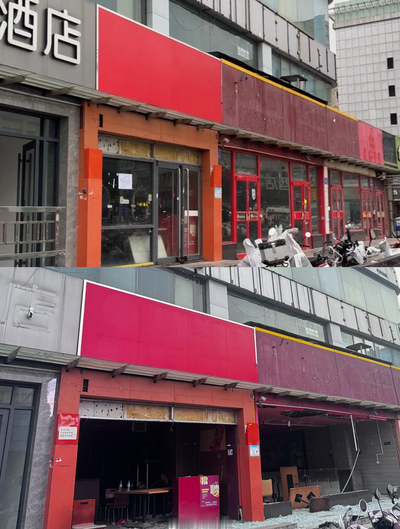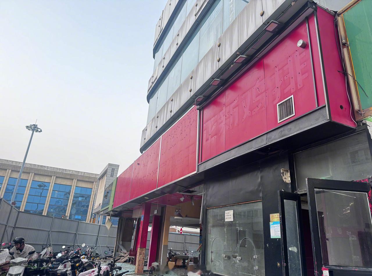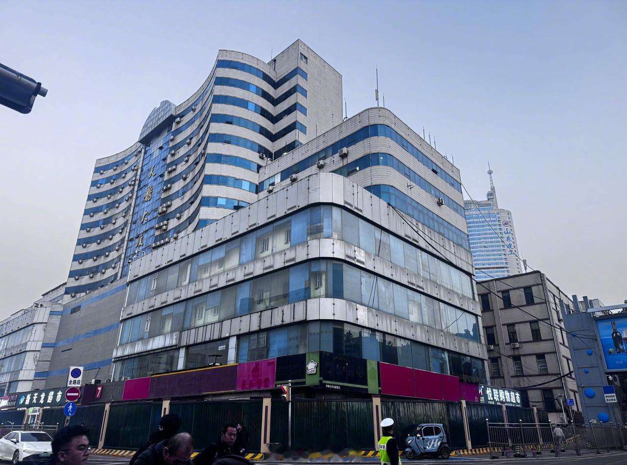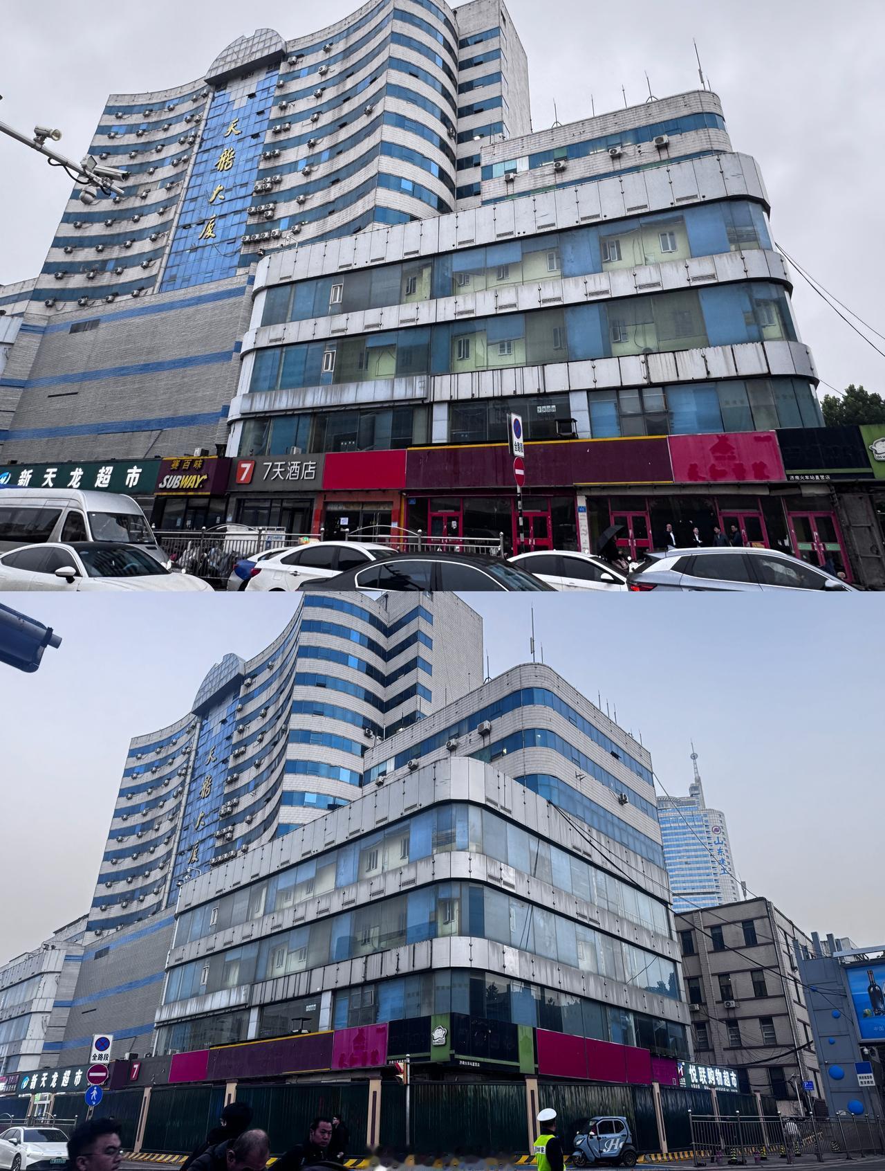 【济南天龙大厦开始拆了 】济南天龙大厦沿街商铺开始拆除 作为济南火车站南场站综合配套建设项目的重要组成部分,备受市民关注的天龙大厦拆迁一事近日迎来关键进展,大厦部分底商店铺已经开始拆迁工作。 10月27日,山东商报·速豹新闻网记者来到项目现场探访发现,天龙大厦楼下东侧和西侧外围已搭建起部分铁皮围挡,此前空置已久的沿街商铺也已动工,原本镶嵌在墙面的玻璃门、玻璃窗已被拆除,玻璃碎碴撒在商铺各个角落;店铺内桌椅摆放杂乱,堆满杂物,断裂的塑料电线管垂落在杂物堆上。