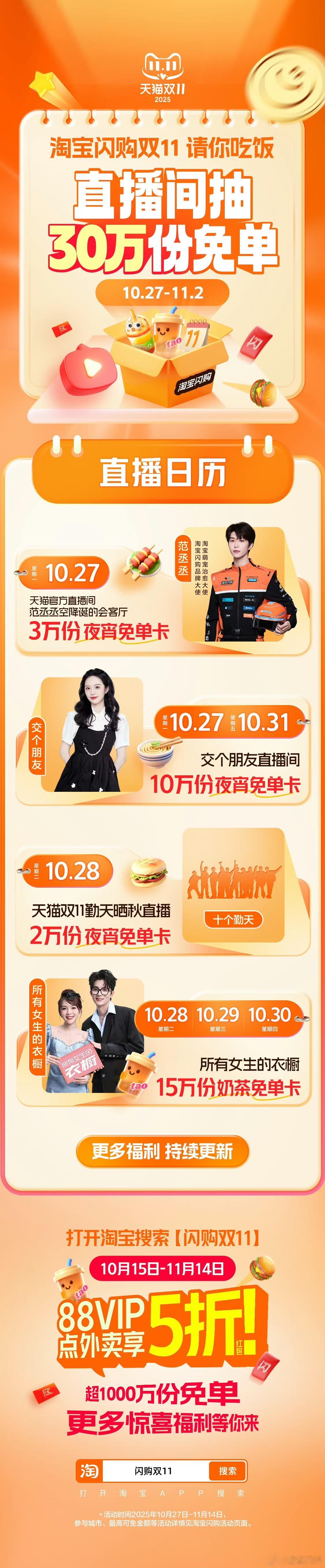 当然了双11福利可不止这些!10月27日至11月14日上淘宝搜🔍【闪购双11】,每周一三五都有免单呢~