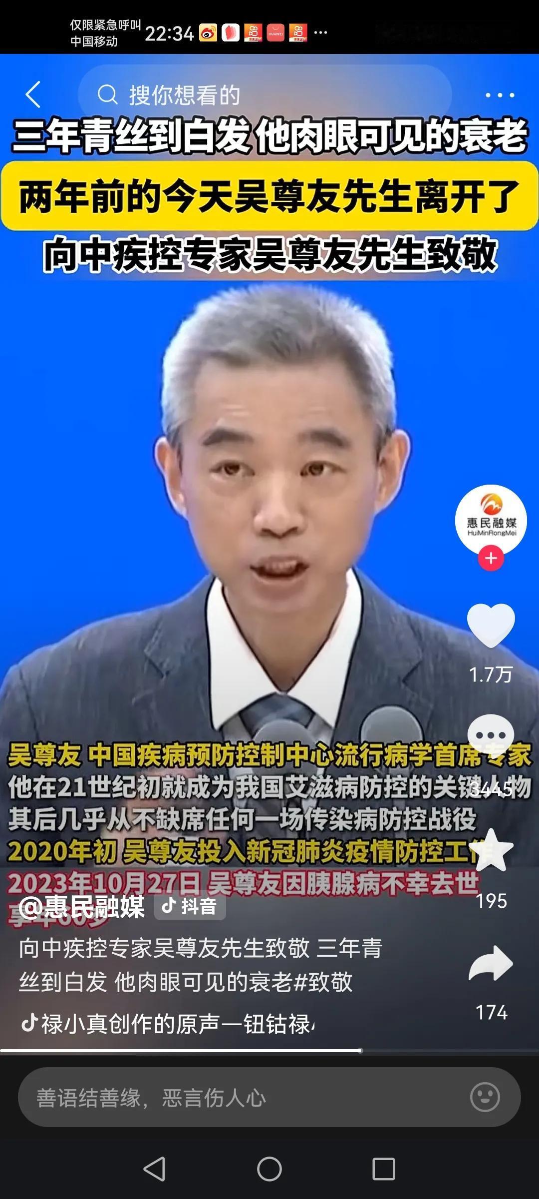 吴尊友是安徽黄山人 从疫情期间刚开始满头黑发到2022年就变成中决满头白发了,2023年10月27日离世,刚刚六十岁,幸苦的工作了那么多年,还没有退休就离开我们了,生前是位工作狂,也是全国人大,今天是他离世的两个年头了,有时候工作期间又会回忆他生前忙碌的工作瞬间,希望您们家人以后都越来越好,以上仅供参考,属个人意见!