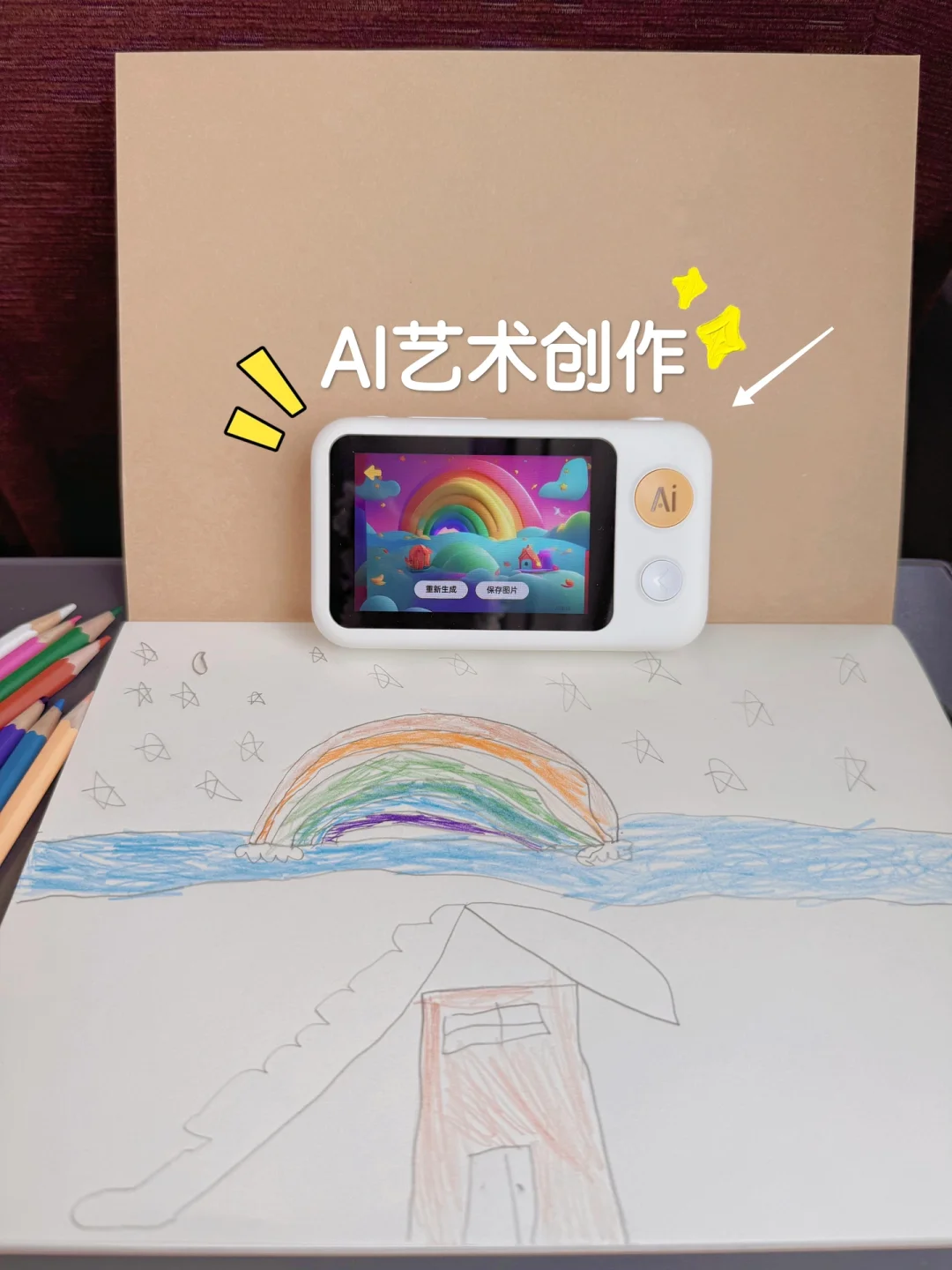 在日本出行经常要坐火车。芙芙路上总爱拿起画笔,看着窗外的风景,随心所欲地涂涂画画,记录下旅途的点滴灵感。而拍学机的AI艺术创作功能更是趣味无穷,它能巧妙地将孩子的简单线条转化为梦幻般的童话世界,让创意无限延伸。
