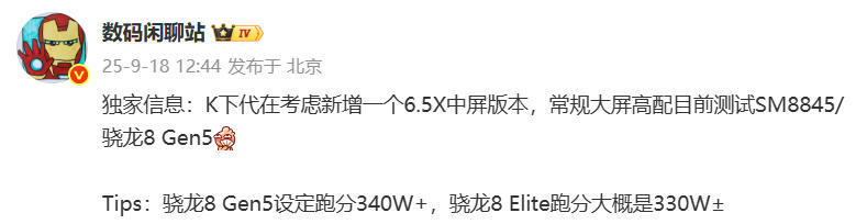 这颗芯片来头可不小,规格能力看齐骁龙8 Elite Gen5,都有3nm工艺、定制化全新Oryon CPU 架构等旗舰配置,当属同宗同源的旗舰双子星。最新爆料骁龙8 Gen5跑分能达到340万左右稳超上代8E,主打能效平衡体验,尤其在中低频能效比8E5控制更好。