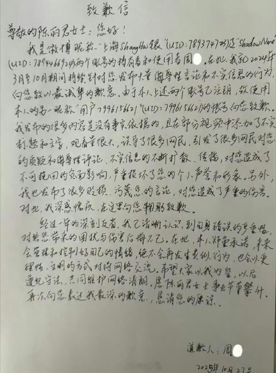 陈丽君黑粉公开视频致歉及手写道歉信致歉,支持陈丽君老师维权[举手]