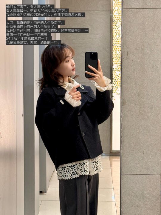 大四,我真的要为自己的人生负责了,必须要独自为自己的人生负责了。我开始自己租房、照顾自己和猫咪、经营感情生活……事情一件件来我一件件解决,24年后半年是我最累的一年,也是我最踏实、充实、清晰的一年。
