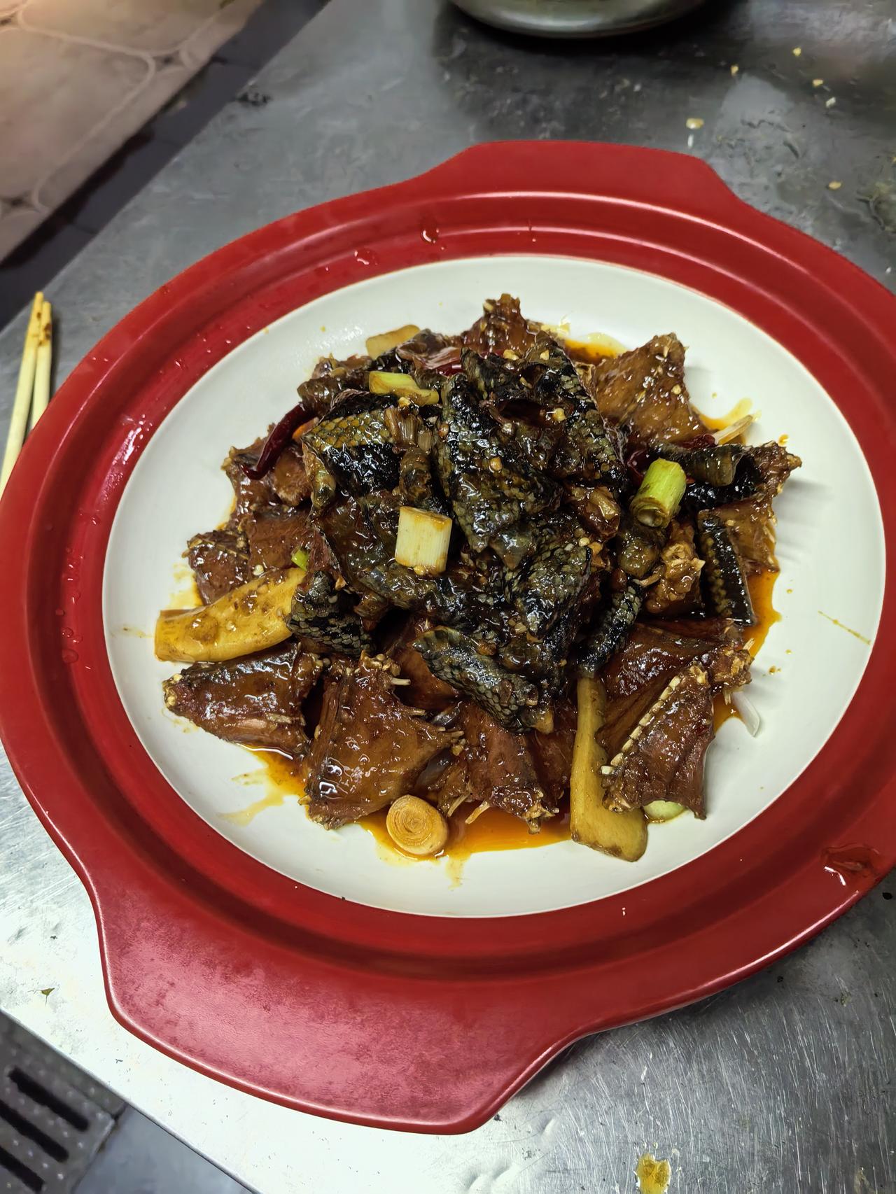 今日晚餐美食分享今日晚餐“辣爽双杀”!厨师亲做姜辣蛇+酱板鸭,香到舔盘停不下来~ 作为掌勺多年的厨师,晚餐必须对自己“狠”一点!今晚的餐桌直接被两道“辣系硬菜”霸屏——姜辣蛇鲜到骨子里,酱板鸭香得直上头,每一口都是舌尖的狂欢! 先夸夸这锅姜辣蛇:现杀的蛇段煎至表皮微焦,裹着老黄姜+泡椒熬的秘制酱汁焖透,掀开锅盖的瞬间,姜香、辣香、肉香直钻鼻腔!咬开肉丝分明,辣得不燥却后劲十足,连炖软的姜片都吸满酱汁,越嚼越香~ 搭配的酱板鸭更是灵魂暴击!自家卤制的鸭身挂满琥珀色卤汁,风干后外皮紧实带劲,撕一块塞进嘴里,咸香鲜辣在舌尖炸开,连骨头都浸满卤香,配米饭能直接炫两碗! 厨师的晚餐从不含糊,这两道硬菜下肚,一天的疲惫全被治愈~ 你们晚餐敢挑战这“辣爽双杀”吗?