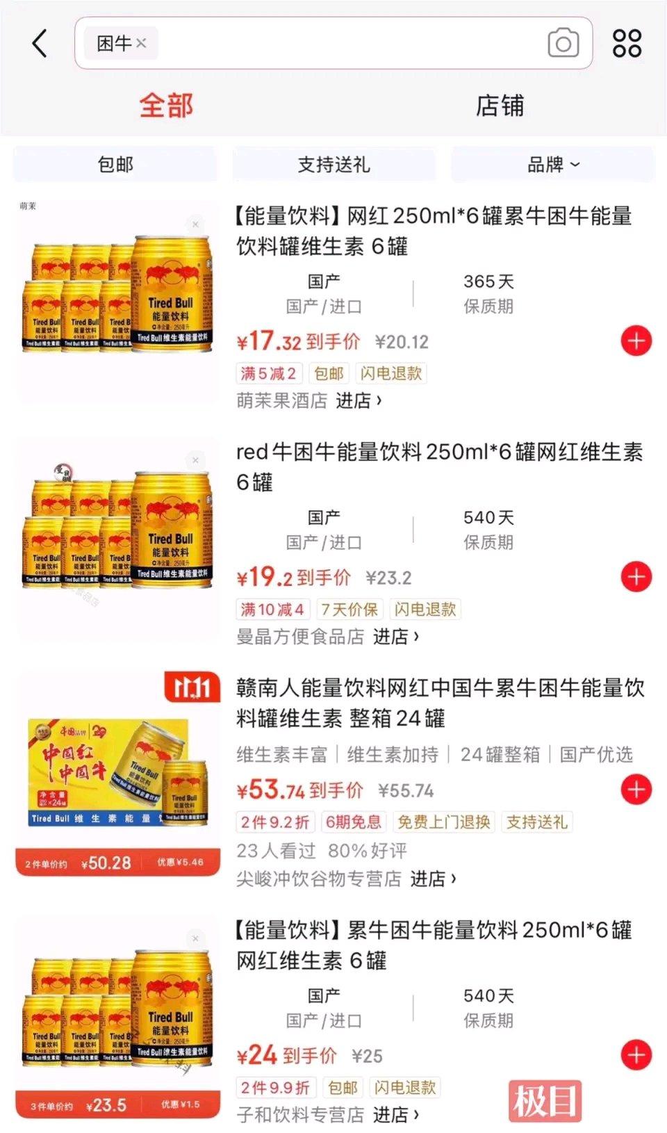网购红牛到手变“困牛累牛”,这事儿真让人无语。有网友下单红牛,收到的却是包装高度相似的“困牛”“累牛”。这种黄色罐装,印着红色牛元素图案和“Tired Bull”字样的饮料,6罐才12元,单价2元,和红牛价格差老远。 委托生产方湖北茹果人生食品有限公司态度还嚣张,拒绝回应问题。不过监管部门行动了,湖北枣阳市吴店镇市监所已介入,石家庄鹿泉区市监局也在核实。虽说商家称资质齐全、商标合规,但这包装故意模仿,很难不让人误购,希望监管能给出公正结果,别让这种“擦边球”产品坑人。
