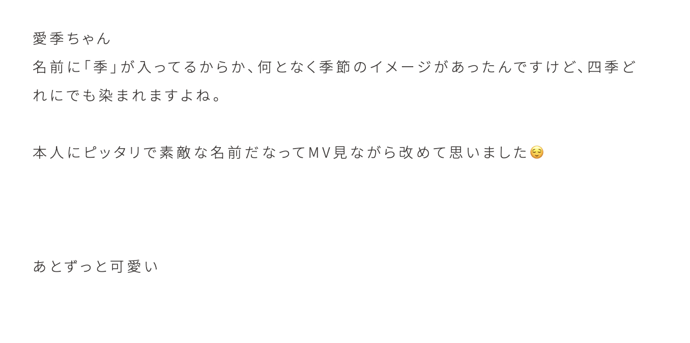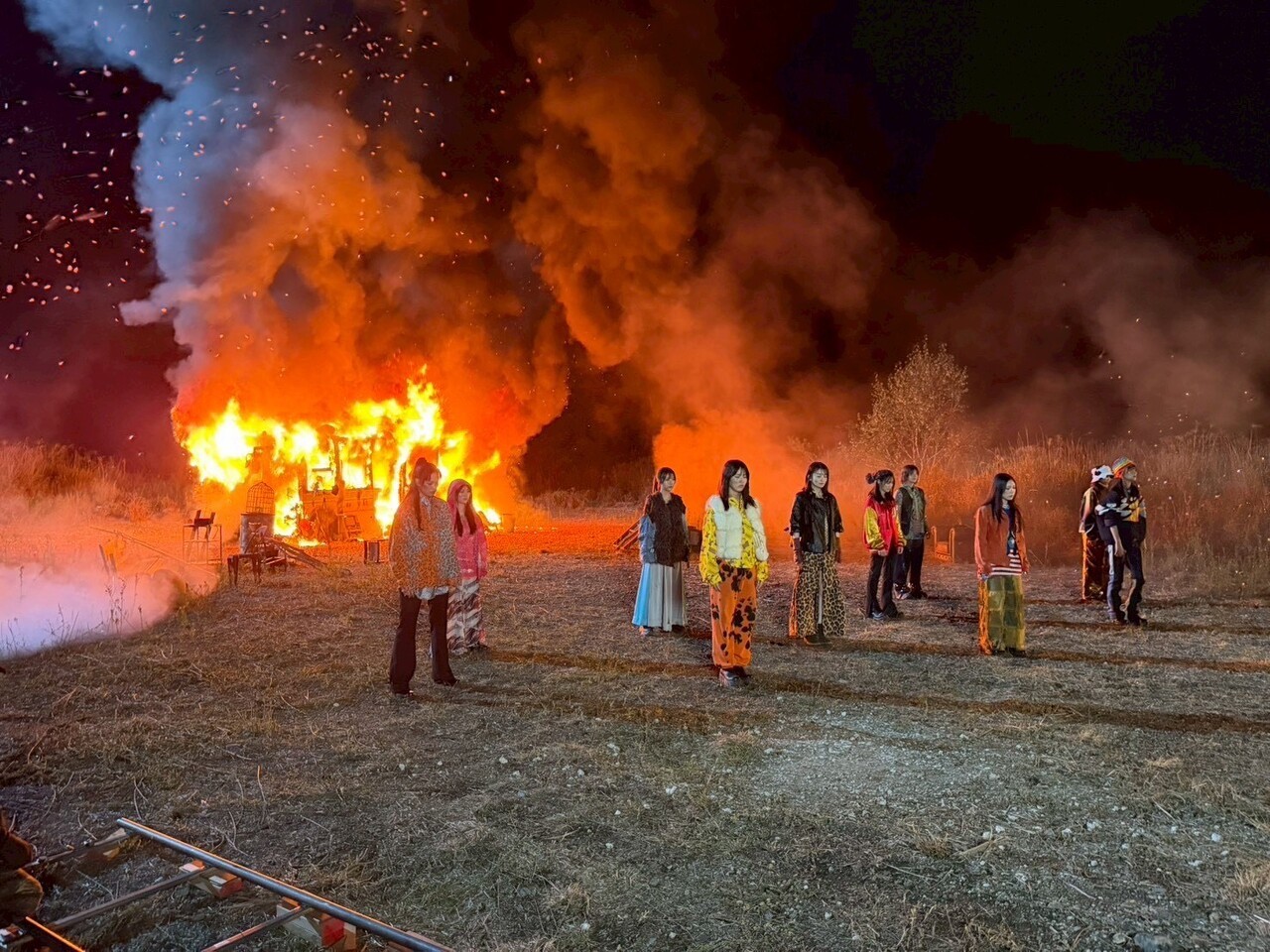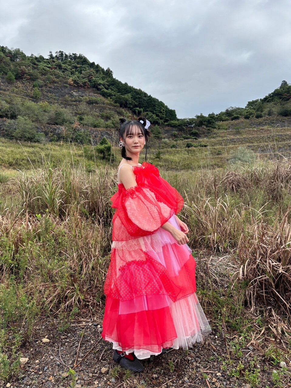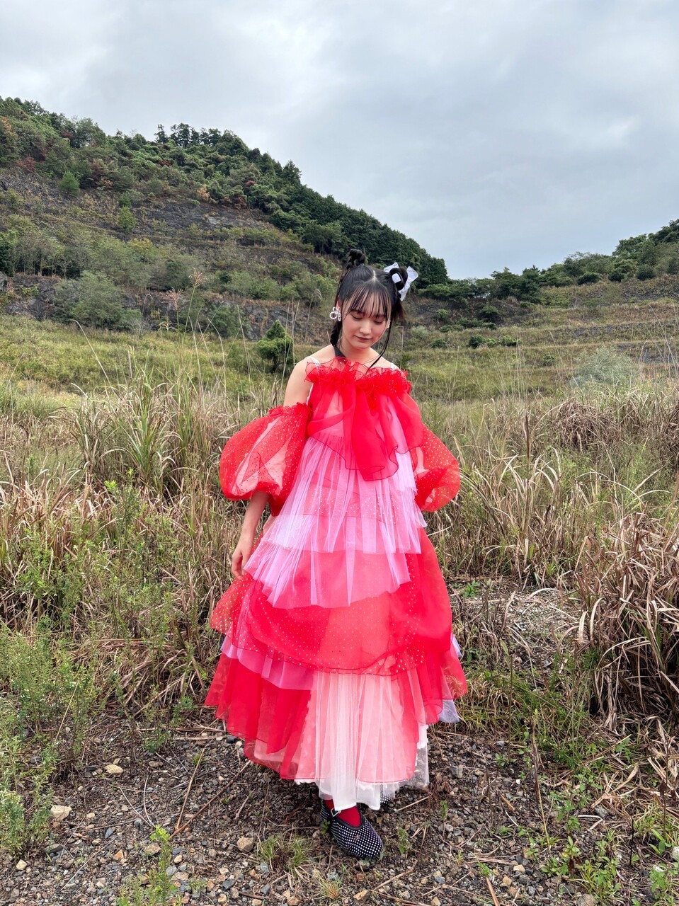きらちゃん「今回、私たちは『コガラシ』です。自然の中を自由な姿で自由に踊っている存在🍁🍂この衣装、イチゴみたいで可愛くてお気に入りです🍓みんなそれぞれ違った色でめちゃくちゃ可愛いかった〜あと、皆髪型が独特でしたよね!コガラシ衣装の方は違和感のあるヘアスタイルでというオーダーだったので、個性的な感じになっています!私はメイクさんにお願いして化け猫モチーフにしてもらいました✨2つの三つ編みが2本の尻尾になってます!お気に入りです🐈⬛」