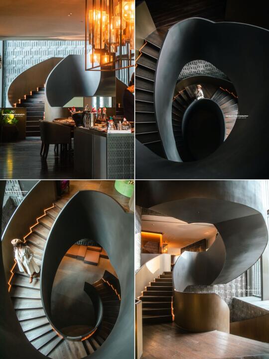▫️公寓楼大堂通往随堂里的旋转楼梯,可以尝试多角度拍摄