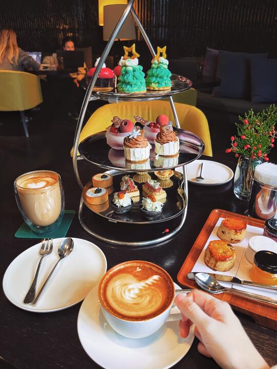 💠Café Gray Deluxe,圣诞月自然要尝试圣诞限定的双人下午茶。套餐精致又上镜,圣诞树形状的蛋糕可爱到舍不得吃!最下层的咸点很合我口味,和甜点搭配在一起让套餐整体的口味很丰富。另外餐厅的露台也是一大亮点,可以俯瞰南京西路的车水马龙。
