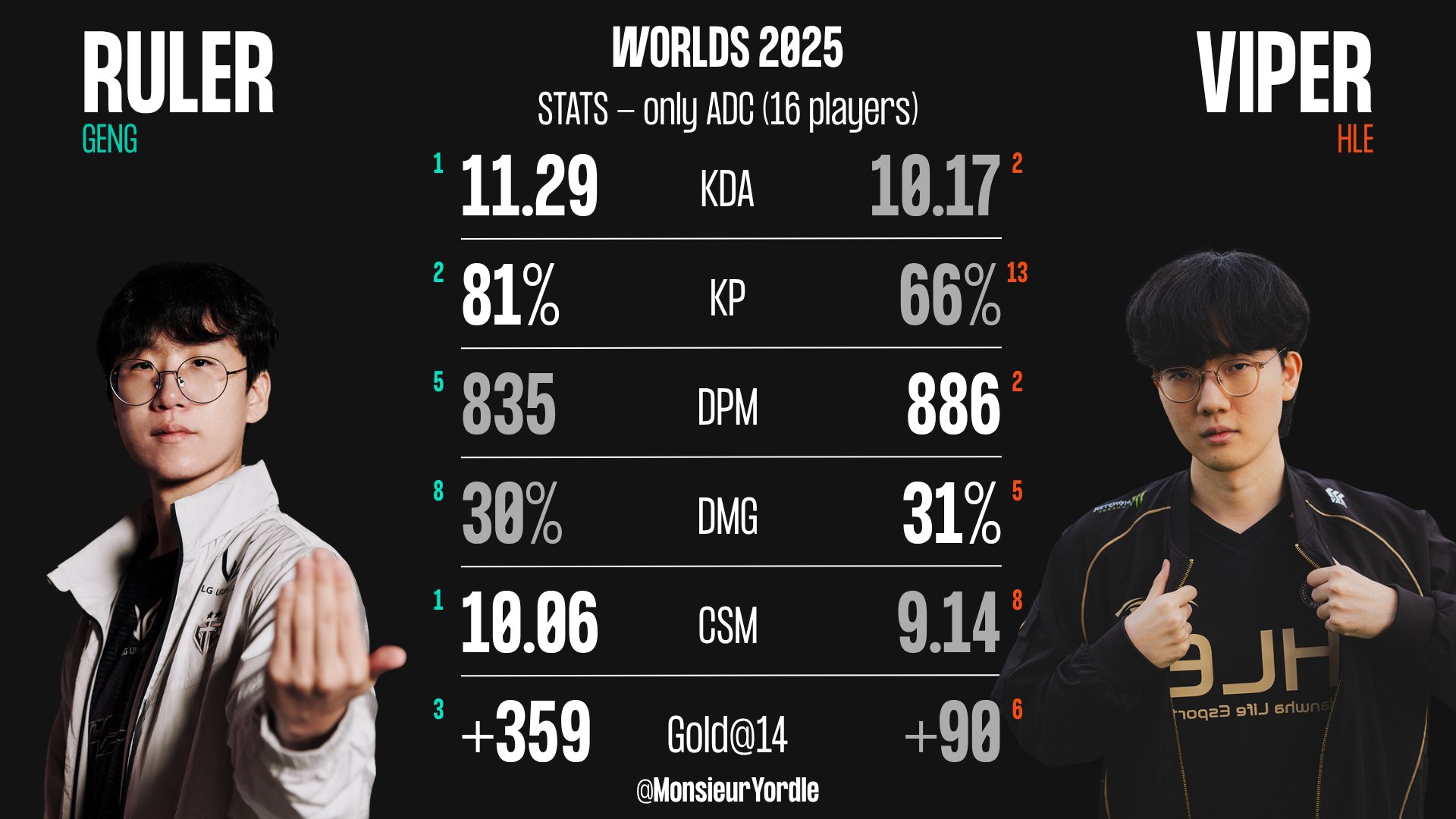 Ruler在KDA、参团率、分均补刀、14分钟对位经济差方面多项领先,而Viper在分均输出、伤害占比方面较为领先。