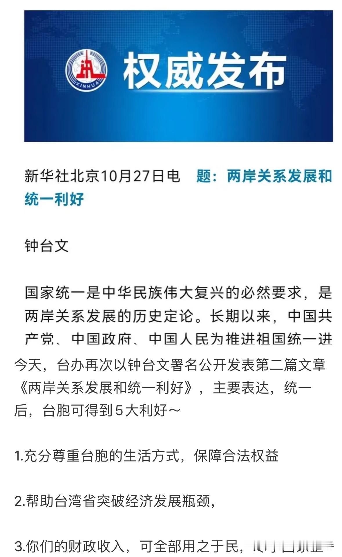 再拖下去, 台湾真的连主动权都没了! 台办最新文章把话说得特明白:统一后财政收入全自用、没战争风险、还能共享大国尊严,这些红利太实在,但“和统窗口不会永远开着”的提醒更该听进去。 大陆对台贸易逆差早破千亿,经济上早就是一家人,美国却非要把台湾当碉堡,根本不管老百姓死活。这哪是给选项,是把利弊摆上台让台湾选。 红利摆着,风险也看着,关键在台湾同胞怎么选。你觉得现在的局势是在逼“台独”回头吗?评论区聊