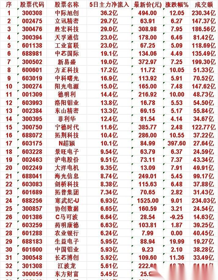 一周,36个亿,砸进了一家公司。 不是你,也不是我。是那些我们口中所谓的“主力”。 你以为这就完了?后面还跟着一串长长的名单:29亿、23亿、19亿……数字一个比一个吓人,像不要钱一样。 我们还在为几毛钱的涨跌心惊肉跳,为菜市场的葱贵了还是便宜了盘算半天。 人家呢? 人家用几十个亿,不动声色地投了个票。 投给谁? 中际旭创、立讯精密、天孚通信、中芯国际…… 你看,清一色的科技、通信、芯片。 这说明什么? 说明那些真正掌握着资本密码的人,他们不看热闹,也不听故事。他们只相信一件事:钱要流向哪里。 钱,永远是最聪明的。 它没有情绪,不会说谎,它只会默默地、坚定地,流向它认为最确定、最有未来的地方。 所以,别总盯着自己手里那点盈亏了。 偶尔抬头看看,看看那些巨鲸,正游向哪片深海。 那才是下一个浪潮的方向。