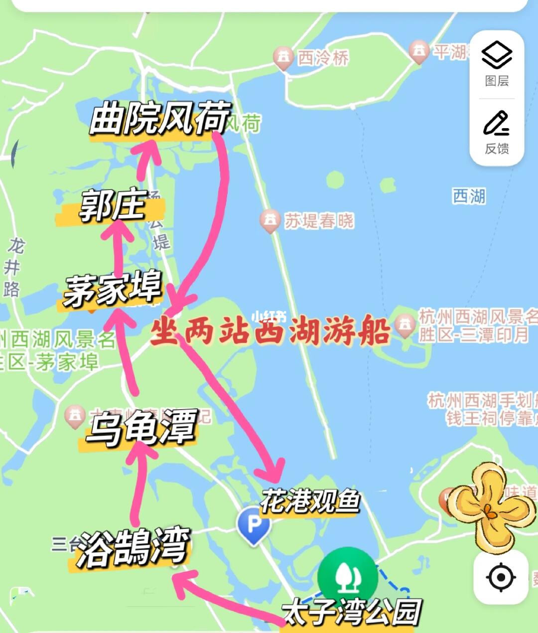 太子湾公园-浴鹄湾-乌龟潭-茅家埠-郭庄-曲院风荷-坐2站西湖游船到花港观鱼-苏堤