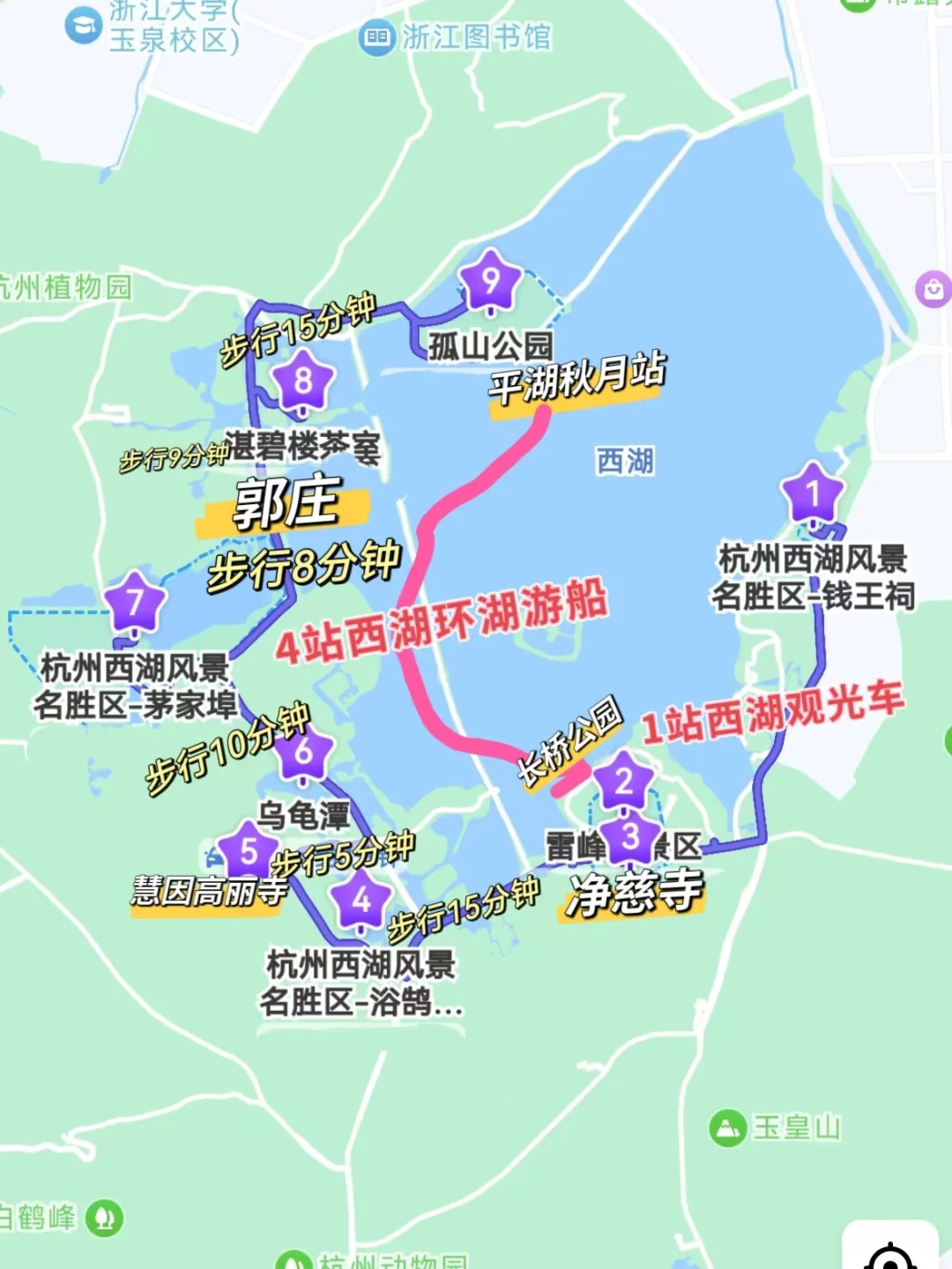 钱王祠-西湖观光车-雷峰塔-净慈寺-浴鹄湾-慧因高丽寺-乌龟谭-茅家埠-郭庄-曲院风荷-岳王庙-孤山-平湖秋月4站西湖游船到长桥公园