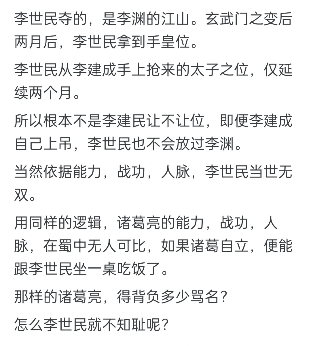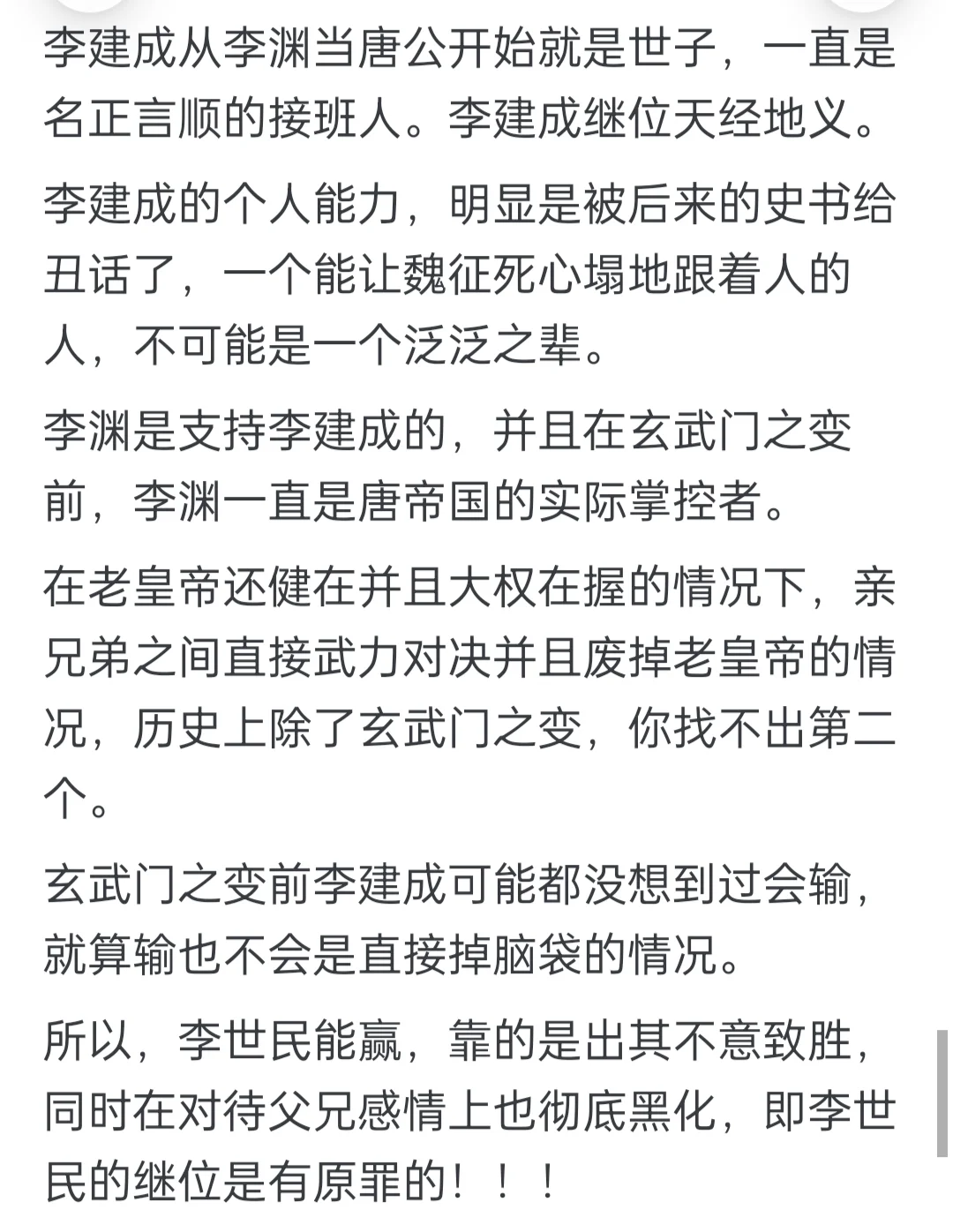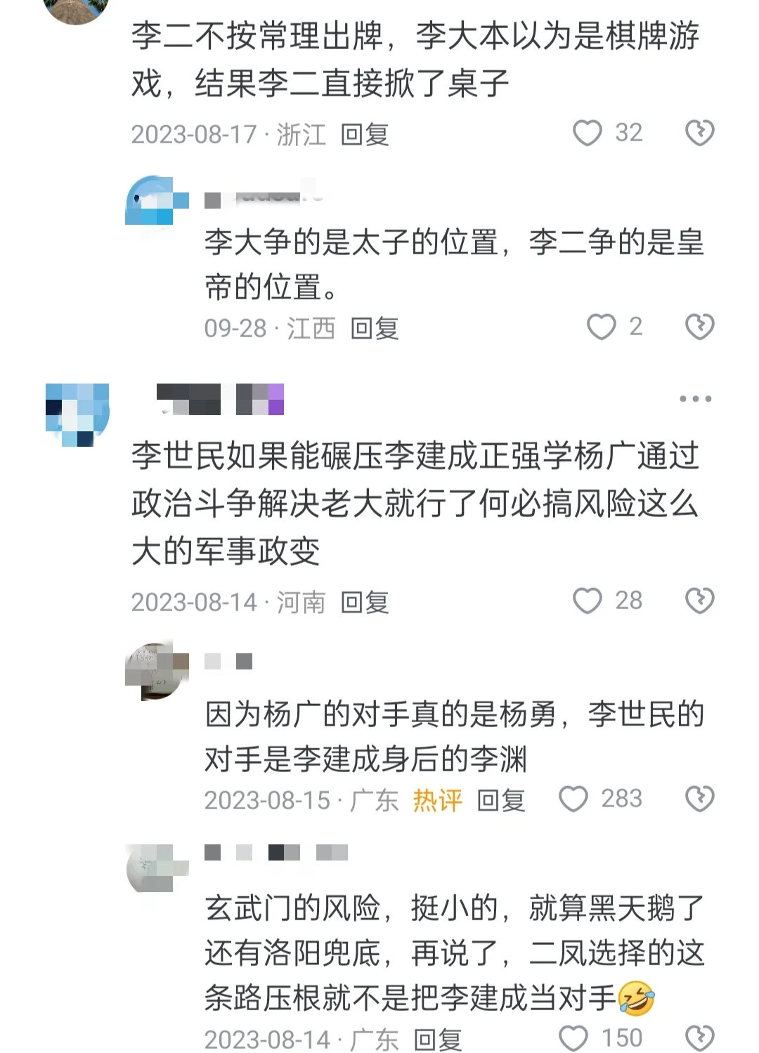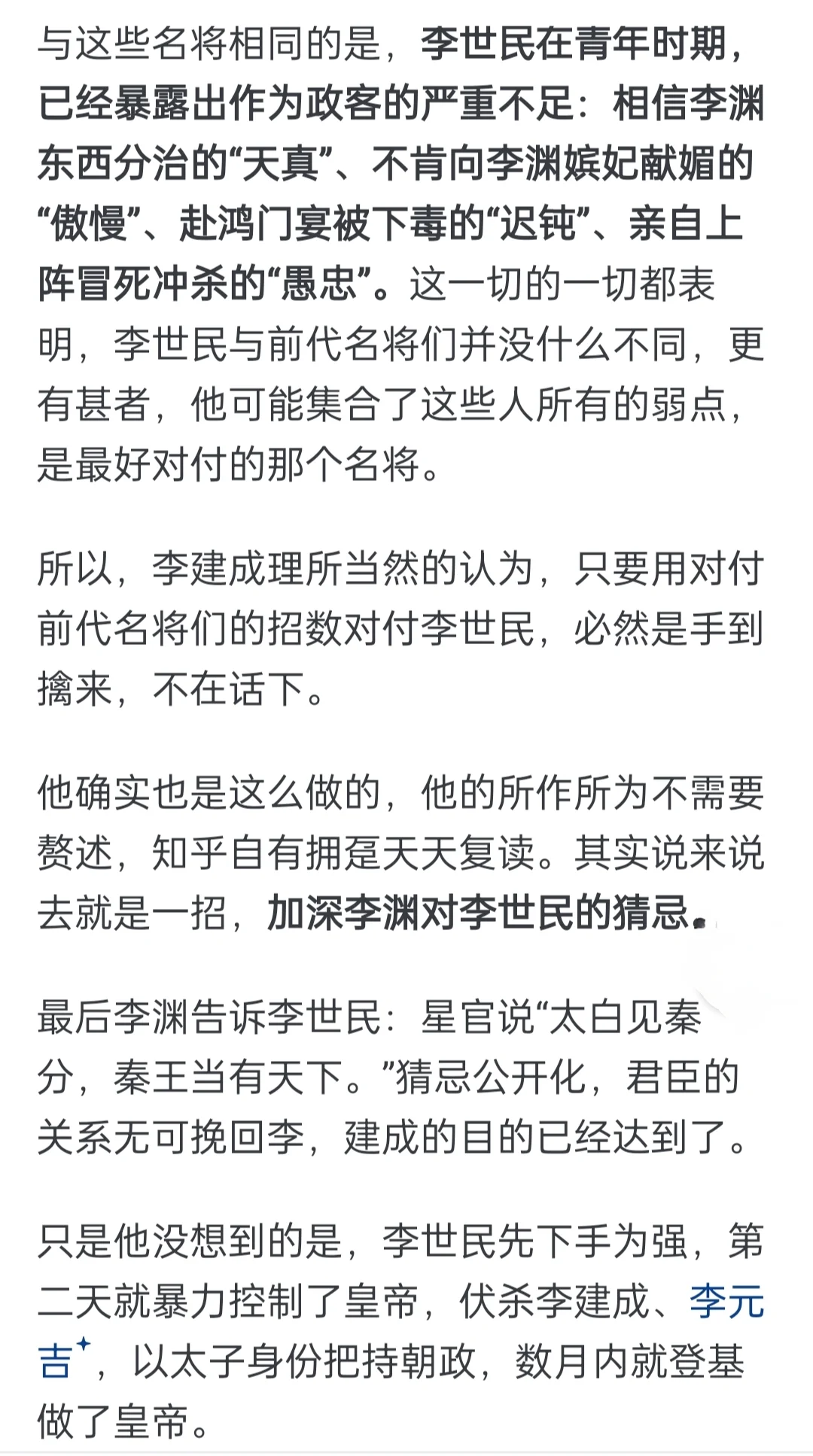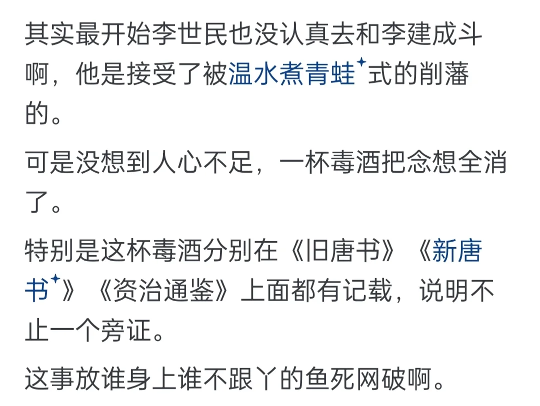 风语 3 2025-12-15 18:08 你说反了!应该说为什么李世民不退出,以保全姓名,留着富贵!李世民都快被李建成打死了,好吧!李世民唯一的优点再军方,但是李建成再军方势力那是一点都不差!把李世民逼得,八百人就八百人!但凡有机会,也不至于这样行险。