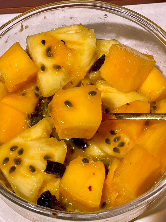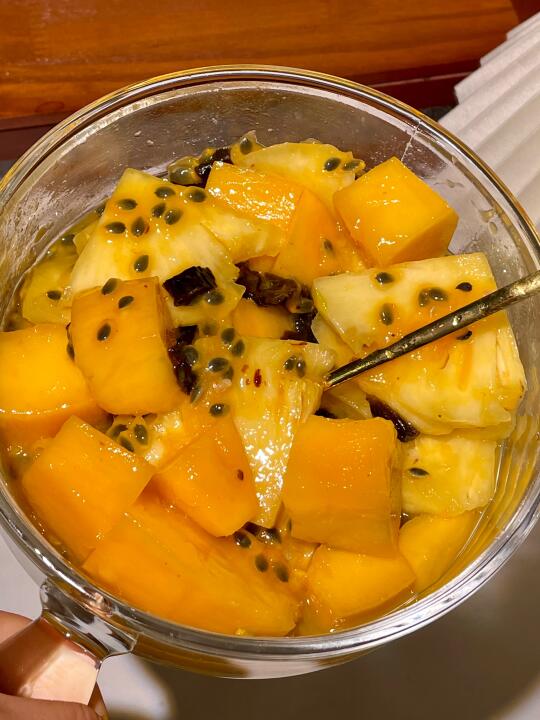 芒果➕菠萝➕百香果!! 淋上两圈蜂蜜,再加点乌梅!! 搅拌后放冰箱冷藏半个小时!! 味道直接上升一个等级!!好好吃!!