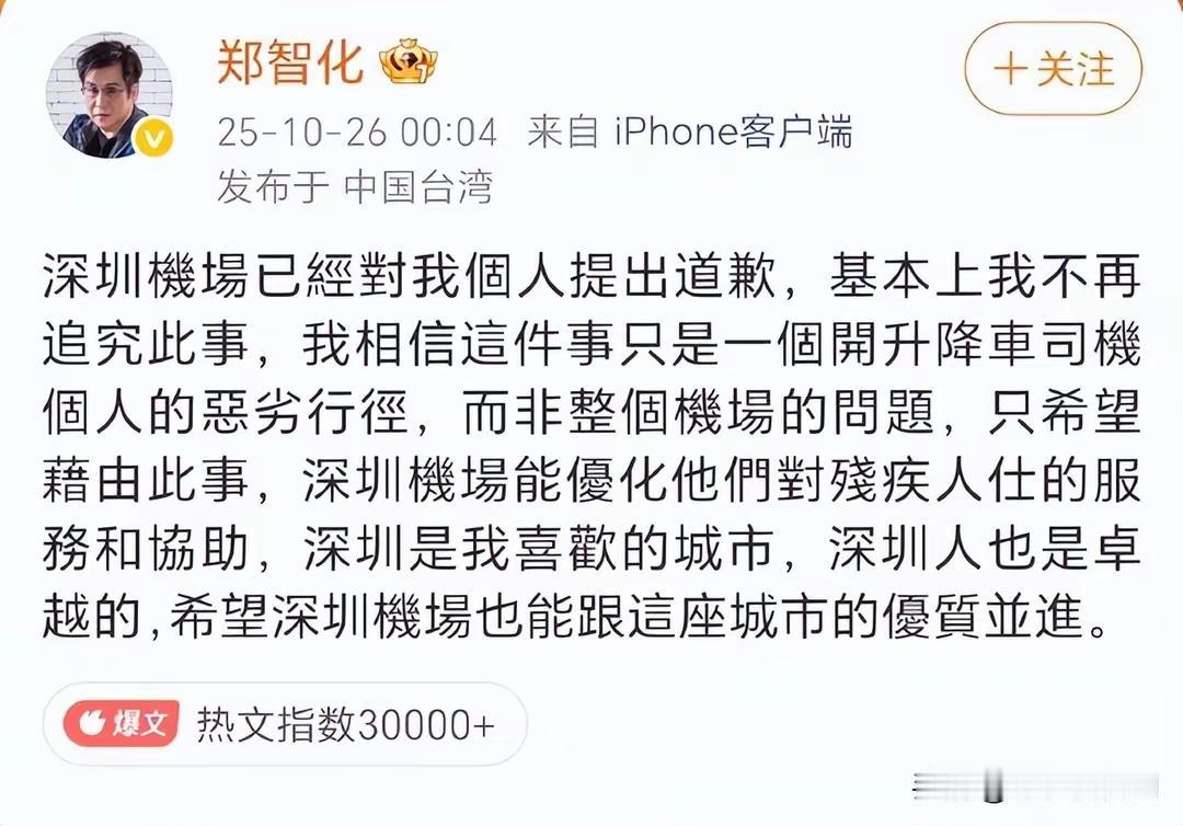 10月25日,台湾残疾人歌手郑智化在社交媒体上发文,指责深圳机场对残疾人“最没人性”。他描述自己乘坐轮椅登机时,因为升降车与机舱门有25公分的高度差,导致他“连滚带爬”才进入机舱,并指责操作升降车的司机态度冷漠。随着事情的发酵,10月27日,郑智化终于顶不住压力道歉了。 他这次道歉一改之前的小作文,反而说当时机场工作人员服务很好,用心搀扶他进入飞机,他表示很感谢。本来想道歉结束这次风波,奈何搬起石头砸自己的脚。把年轻时自己积累的那么一点观众缘彻底败没了。这一次,他想要的“特权”,让他沦为了一场笑话。 有网友表示:这种人不可原谅,大陆应该把此人拉入黑名单,永不准踏入大陆半步,不单说他是诬陷,这人简直是无耻至极,小儿麻痹的后遗症至今才完全显现。 关键是,作为一个儿麻后遗症柱双拐可以行走的人,登机过程中,四五名工作人员搀扶你登机,顺利回到台湾老家后,发文撒谎说没有人管。恶人。 看看,这就是湾湾,一直在大陆赚钱,享受巨大声誉和利益,5人服务他上飞机,回头诬陷机场工作人员,要不是有监控,估计又有人被开除了,这种人一边享受红利,一边骂娘,都是惯的。 之前我一直比较同情这位台湾的残疾歌手,但是针对深圳机场一事,他在我心中的形象一落千丈,他如湾湾心态一样,离不开大陆,又想赚大陆的钱,但还一直抱怨着大陆,这一切都是惯的,想赚钱就不要去怕任何困难,否则就老老实实的待在湾里。 做为机场服务项目应与国际接规,不论内外应一视同仁,不要画蛇添足的对外国及港台人有特殊服务,腰应站直了,这事要是在美西方,相信这个家伙也绝不敢提过分要求,更不敢违心的胡说八道,看来人善了不一定会得到回报,堂堂正正的做人。 对此大家怎么看呢