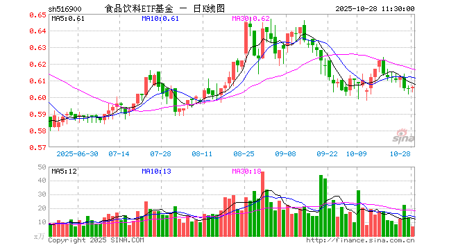 10月28日,截止午间收盘,食品饮料ETF基金(516900)涨0.17%,报0.606元,成交额401.35万元。食品饮料ETF基金(516900)重仓股方面,贵州茅台截止午盘涨0.46%,五粮液涨0.05%,伊利股份跌0.29%,山西汾酒涨2.31%,泸州老窖涨1.36%,海天味业跌0.90%,东鹏饮料涨0.10%,洋河股份涨0.07%,今世缘涨0.23%,双汇发展跌0.59%。