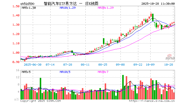 10月28日,截止午间收盘,智能汽车ETF易方达(516590)涨0.91%,报1.328元,成交额473.20万元。智能汽车ETF易方达(516590)重仓股方面,宁德时代截止午盘涨1.51%,比亚迪涨0.15%,立讯精密涨0.08%,汇川技术涨0.23%,豪威集团涨3.09%,长城汽车涨0.39%,科大讯飞涨2.23%,长安汽车跌0.63%,三花智控涨4.24%,亿纬锂能涨2.93%。
