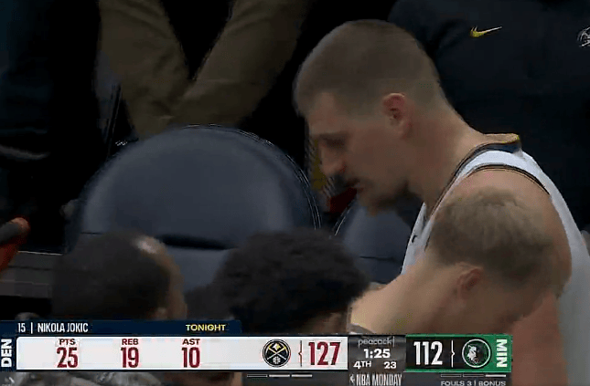 比赛的第四节,约基奇得到25分19篮板10助攻,再次达成三双,本赛季前三场比赛全部收获三双数据。
