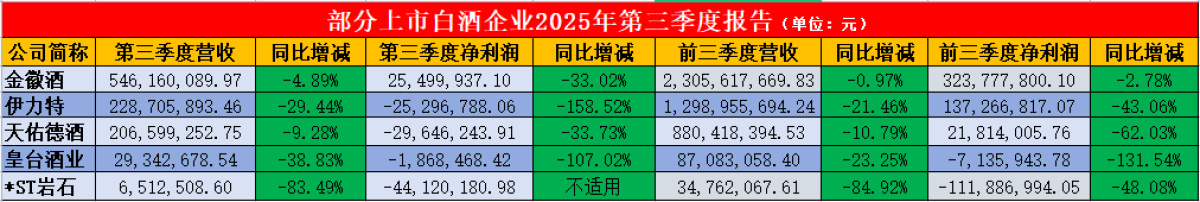 俗话说,金九银十。然而,2025年白酒行业的“金九银十”旺季并未如期回暖。截至10月28日,已披露第三季报告的5家上市白酒企业,无论单季还是前三季度,营收、净利润均呈现双双下降的现实情况。其中,上海贵酒(*ST岩石)的退市危机,更是将中小酒企的生存压力推向舆论的风口浪尖。业界人士认为,行业调整周期中,“马太效应”正加速重塑市场格局。