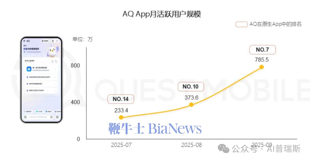 紧随其后的“垂直AI”阵营中,豆包爱学、AQ(支付宝旗下AI健康顾问)与快对AI表现亮眼,三者月活分别为876万、785万和647万。