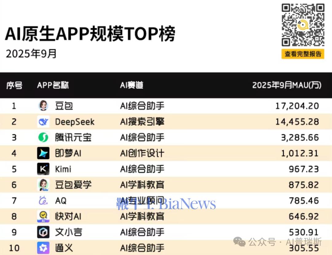 豆包以1.72亿月活跃用户超越DeepSeek的1.45亿,登上AI原生应用榜首。腾讯元宝、即梦AI、Kimi分列其后,月活分别达到3286万、1012万和967万。