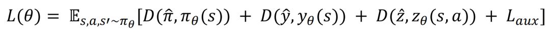 智能体的参数(θ)会被更新,以最小化其预测和策略与来自元网络的目标之间的距离。智能体的损失函数可以表示为: