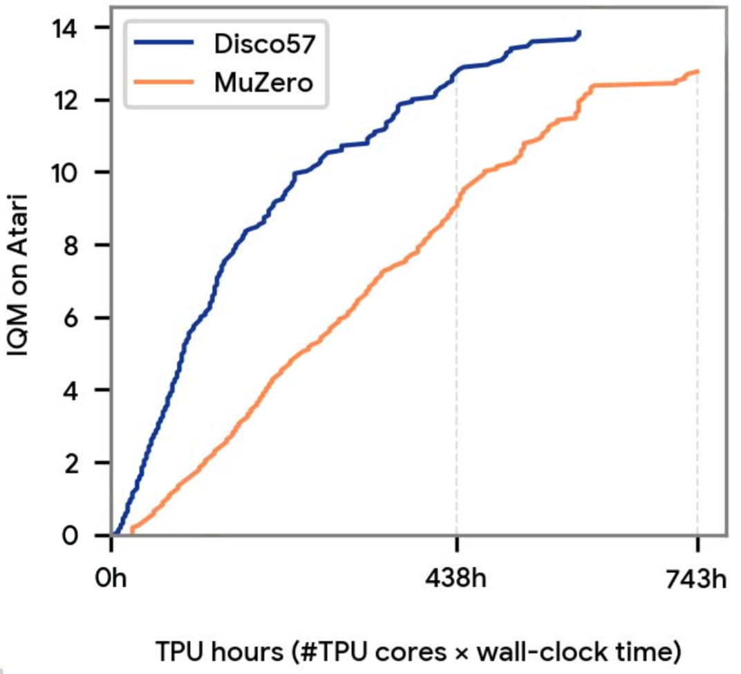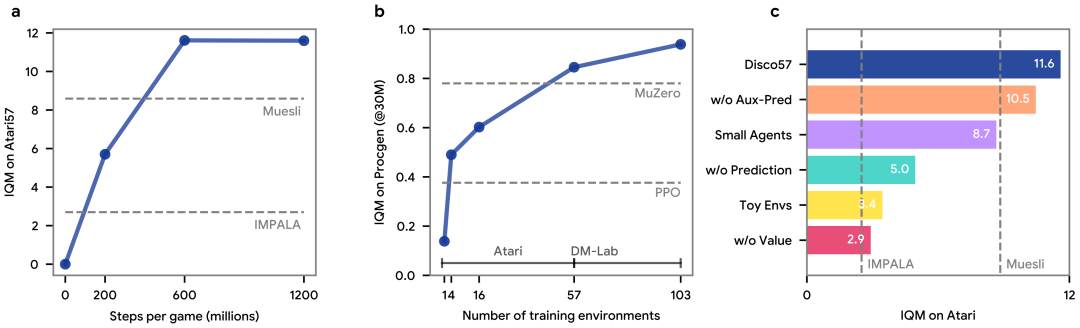 为了进一步了解该团队方法的可扩展性和效率,该团队在发现过程中评估了多个Disco57(见上图a)。最佳规则是在每个Atari游戏约6亿步(内发现的,这相当于在57个Atari游戏上仅进行了3次实验。这可以说比手动发现RL规则更有效率,后者通常需要执行更多的实验,此外还要花费人类研究员的时间。