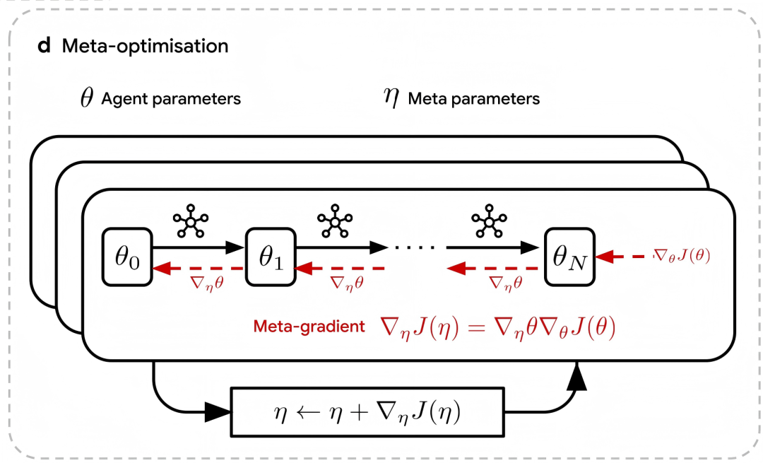 该团队的目标是发现一个RL规则(由元参数η表示的元网络来代表),它能让智能体在各种训练环境中最大化奖励。这个发现目标J(η)及其元梯度