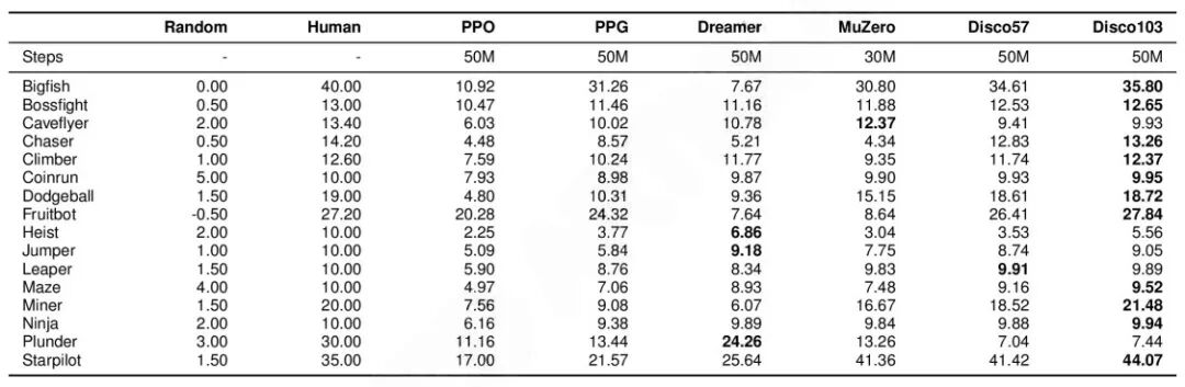 在ProcGen基准上的结果显示,Disco57优于所有现有的已发表方法,包括MuZero和PPO,尽管它在发现期间从未与ProcGen环境交互过。ProcGen由16个程序生成的2D游戏组成。