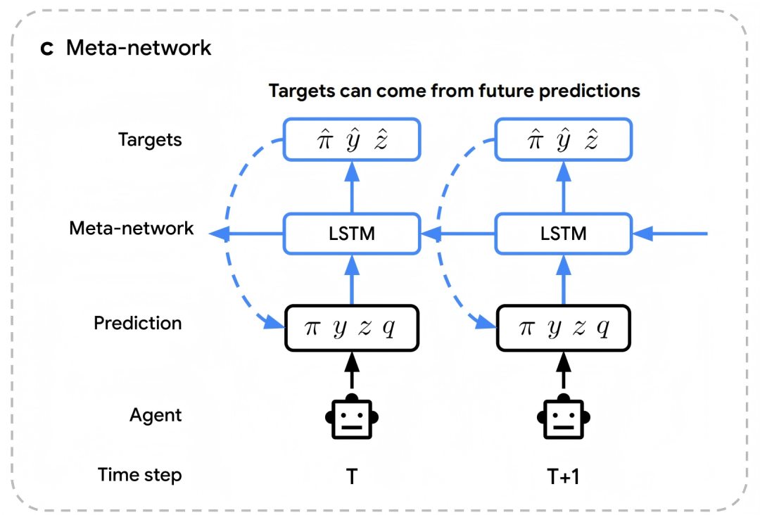 该团队没有采用手工设计的方式,而是定义了一个没有预定义语义、富有表现力的预测空间,并通过使用元网络进行元学习,来找出智能体需要优化的内容。他们希望在保留表征现有强化学习算法中核心思想能力的同时,也支持广阔的新颖算法可能性空间。