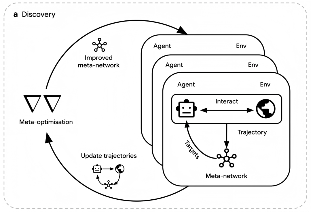 该团队的发现方法涉及两种类型的优化:智能体优化和元优化。智能体参数通过将其策略和预测更新至强化学习规则所产生的目标来进行优化。与此同时,强化学习规则的元参数则通过更新其目标来进行优化,以最大化智能体的累积奖励。