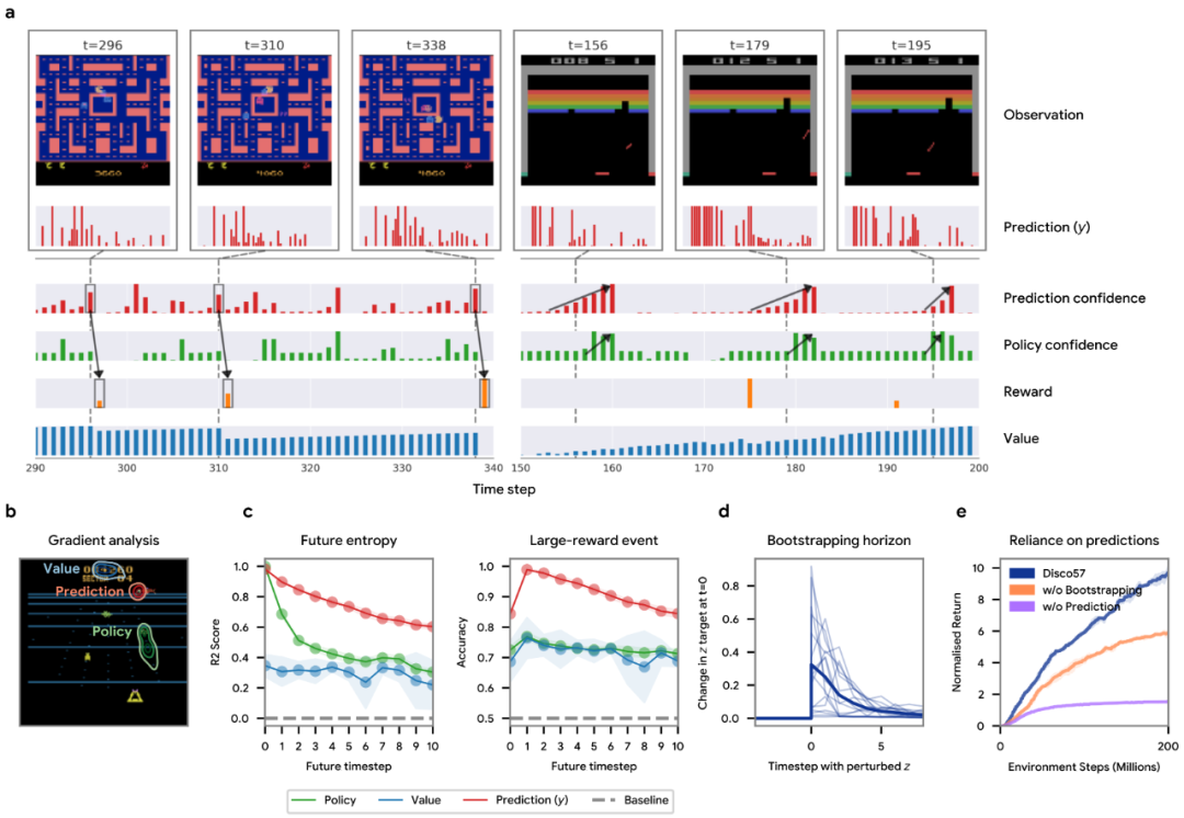 该团队还通过测量与观测的每个部分相关的梯度范数,研究了观测中的哪些特征会导致元学习的预测产生强烈反应。图b的结果显示,元学习的预测倾向于关注未来可能相关的物体,这与策略和价值函数所关注的地方不同。这些结果表明,DiscoRL已经学会了在一个适度的范围内识别和预测显著事件,从而补充了诸如策略和价值函数等现有概念。