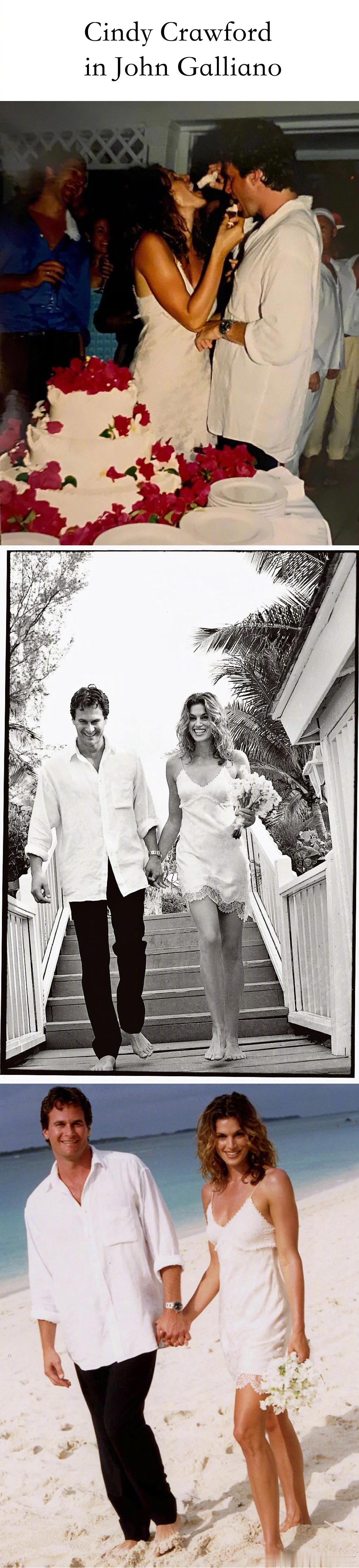 Cindy Crawford 的婚纱礼服也来自 John Gallino,是非常简单的短裙。她说自己当时想要低调一些,只是跟造型师朋友说要参加一个沙滩派对,轻松时髦就行了。现在看依旧不过时。