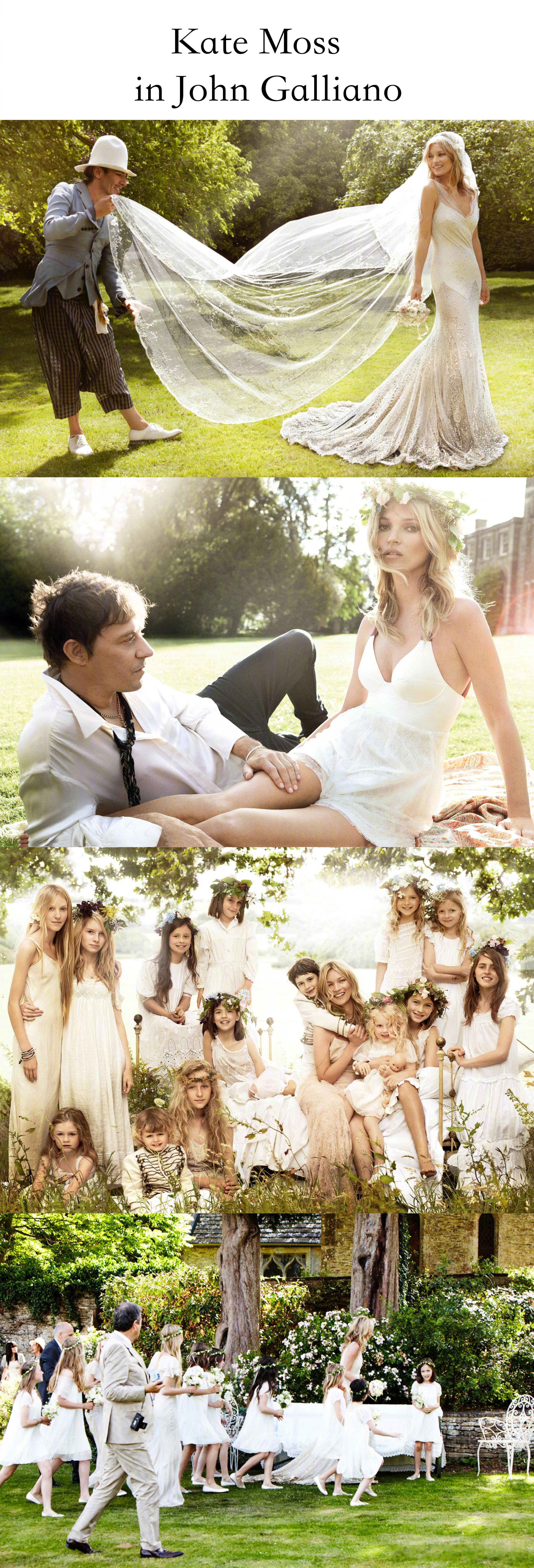 Kate Moss 的婚礼阵仗特别大,美版 VOGUE 2011年9月刊的整篇封面故事都是关于她的。婚纱来自好友 John Galliano,当时的 John 处在争议焦点,Kate Moss 不顾舆论压力选择他,很有义气。