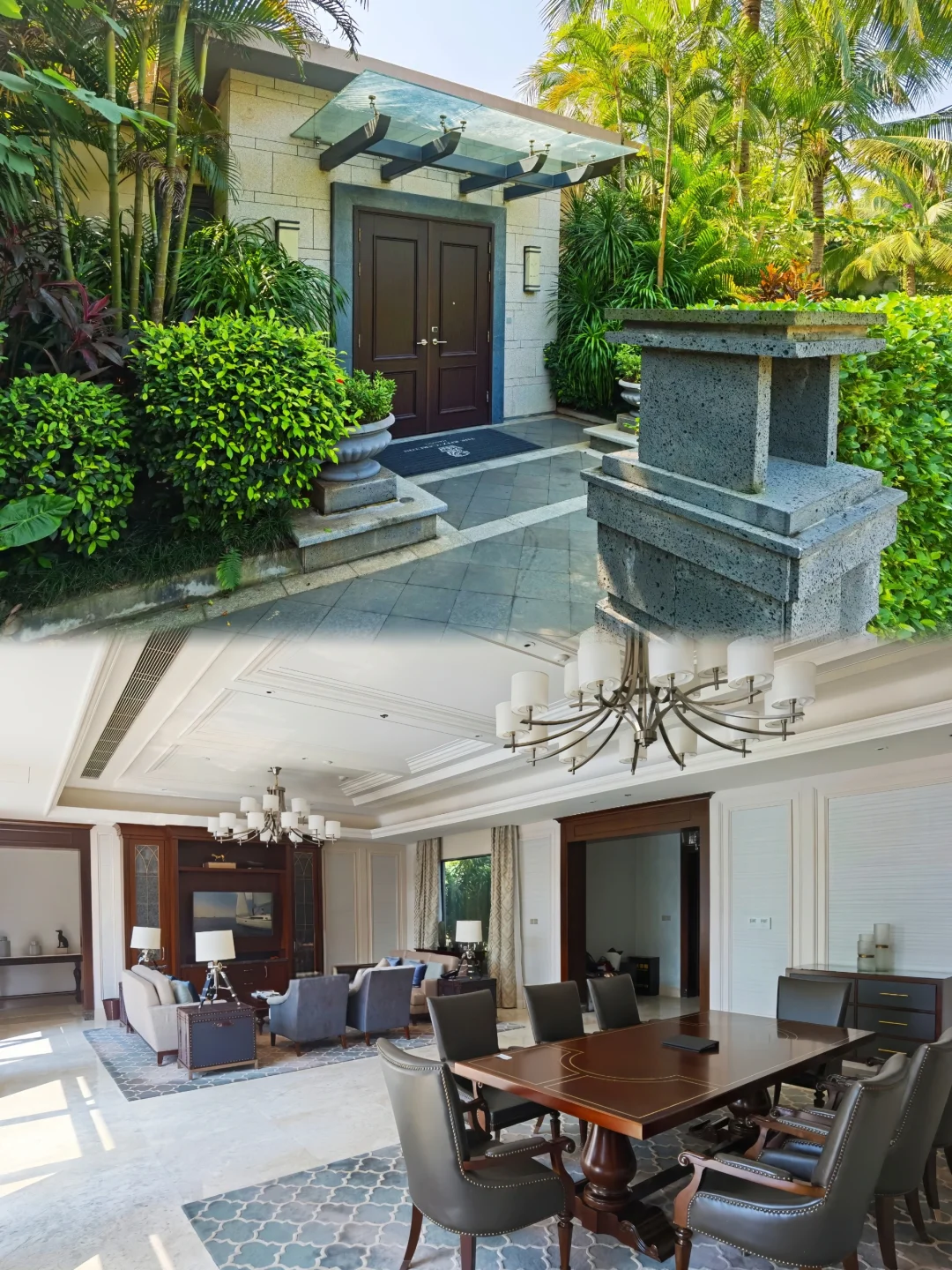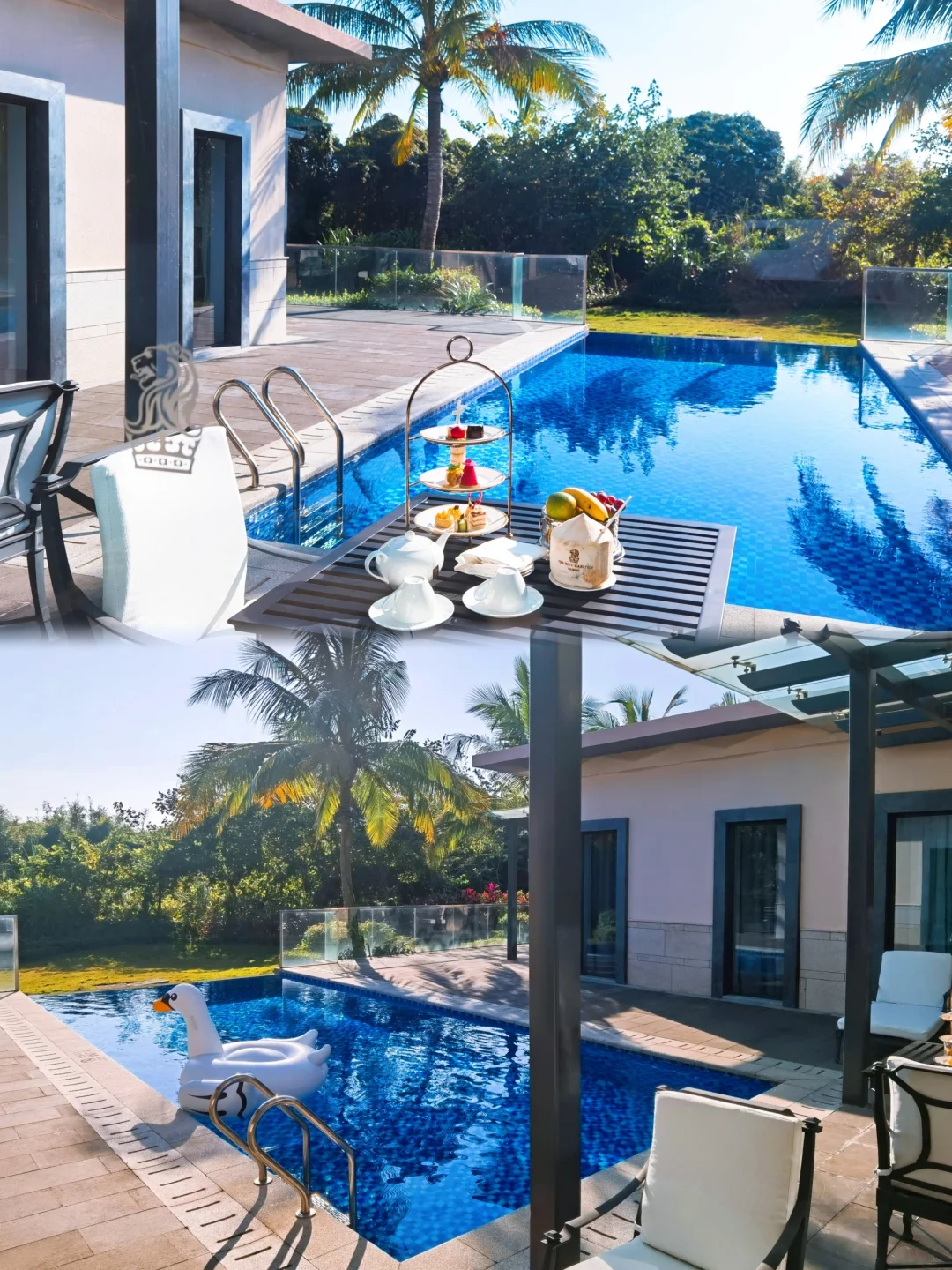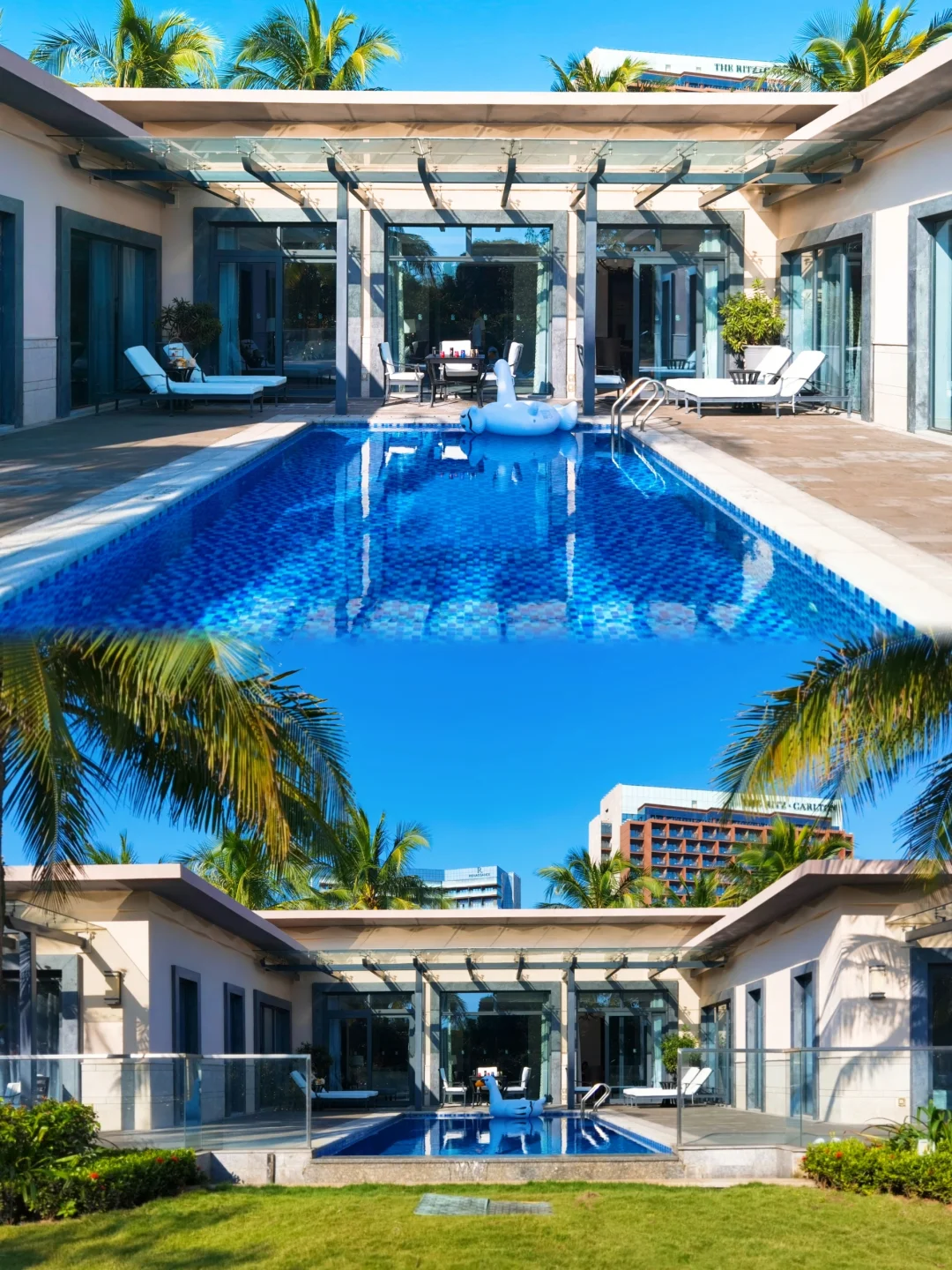海口丽思卡尔顿的别墅不参与会员升级,虽然有万豪白金卡但是在丽思卡尔顿没有任何用处,只能现金定别墅。这家丽思卡尔顿的别墅起步就是双卧,分别是一个大床和一个双床,连接两个卧室的中间是客厅加餐厅一起外面有一个无边框泳池直通户外的花园。大号泳圈这些都是免费提供。