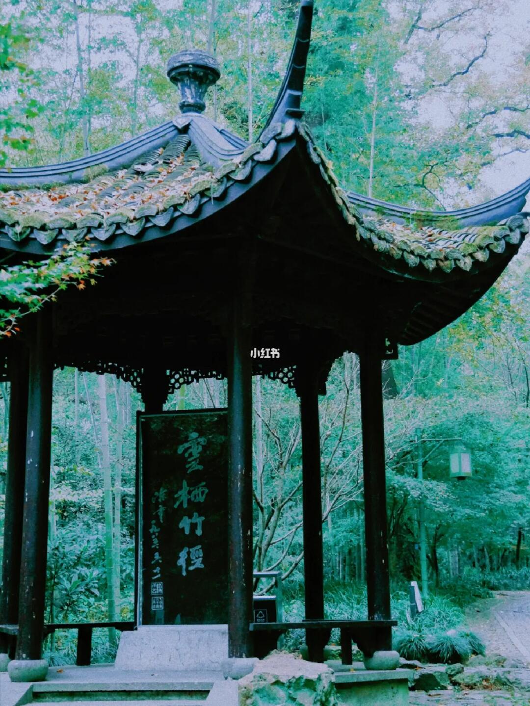 从云栖牌坊进去,见到的第一个亭子,旁边溪水叮咚,在这拍古风绝美
