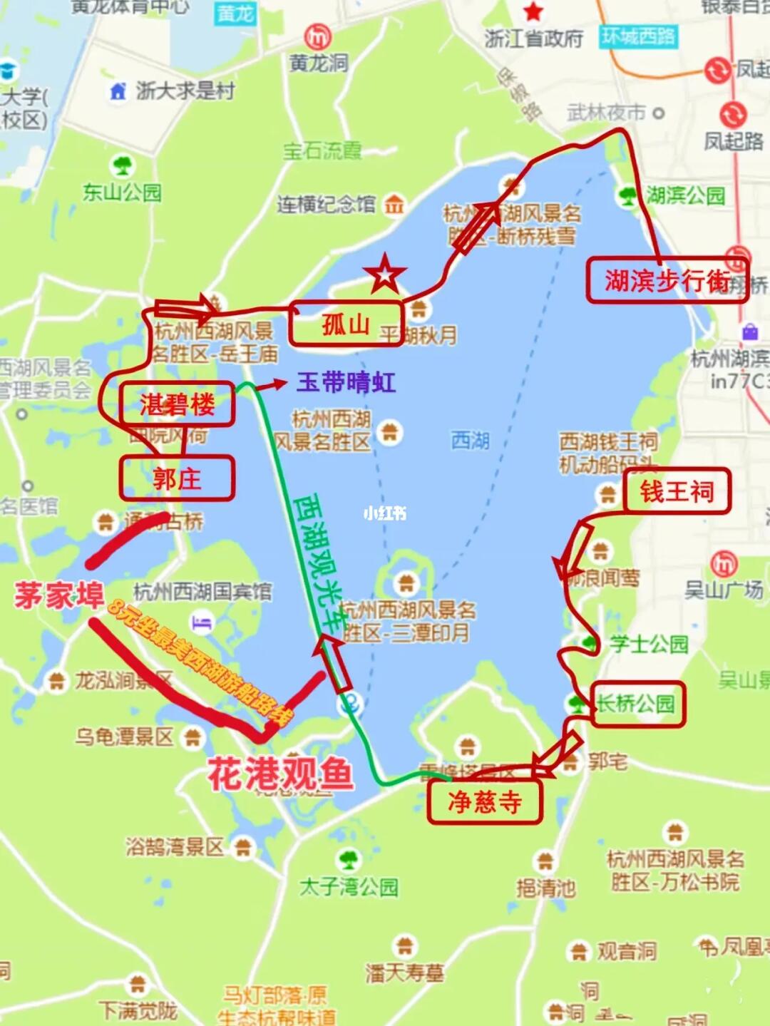 [向右R]钱王祠-长桥公园-净慈寺-花10元坐西湖公交车去曲院风荷-湛碧楼-郭庄-曲院风荷4号门坐西湖游船到茅家埠-8元西湖游船到花港观鱼-西湖观光车10元到孤山公园(详见图2)-白堤-断桥-湖滨逛街